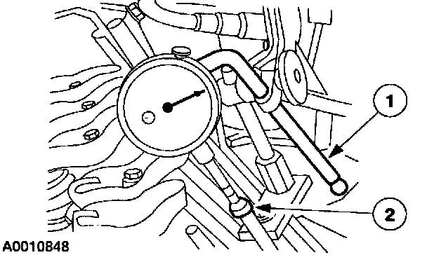 5. Zero the dial indicator. Continue to rotate the crankshaft until the (1) high-lift point of the camshaft lobe is in the fully-raised position (highest indicator reading).