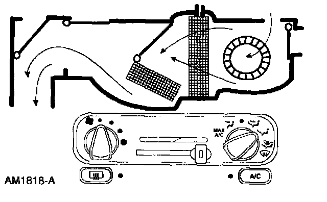 ^ Air will be picked up at the recirculation opening by the blower motor. With the temperature control set for maximum cold, airflow across the A/C evaporator core will be diverted past the heater core and then directed into the passenger compartment through the instrument panel A/C registers.