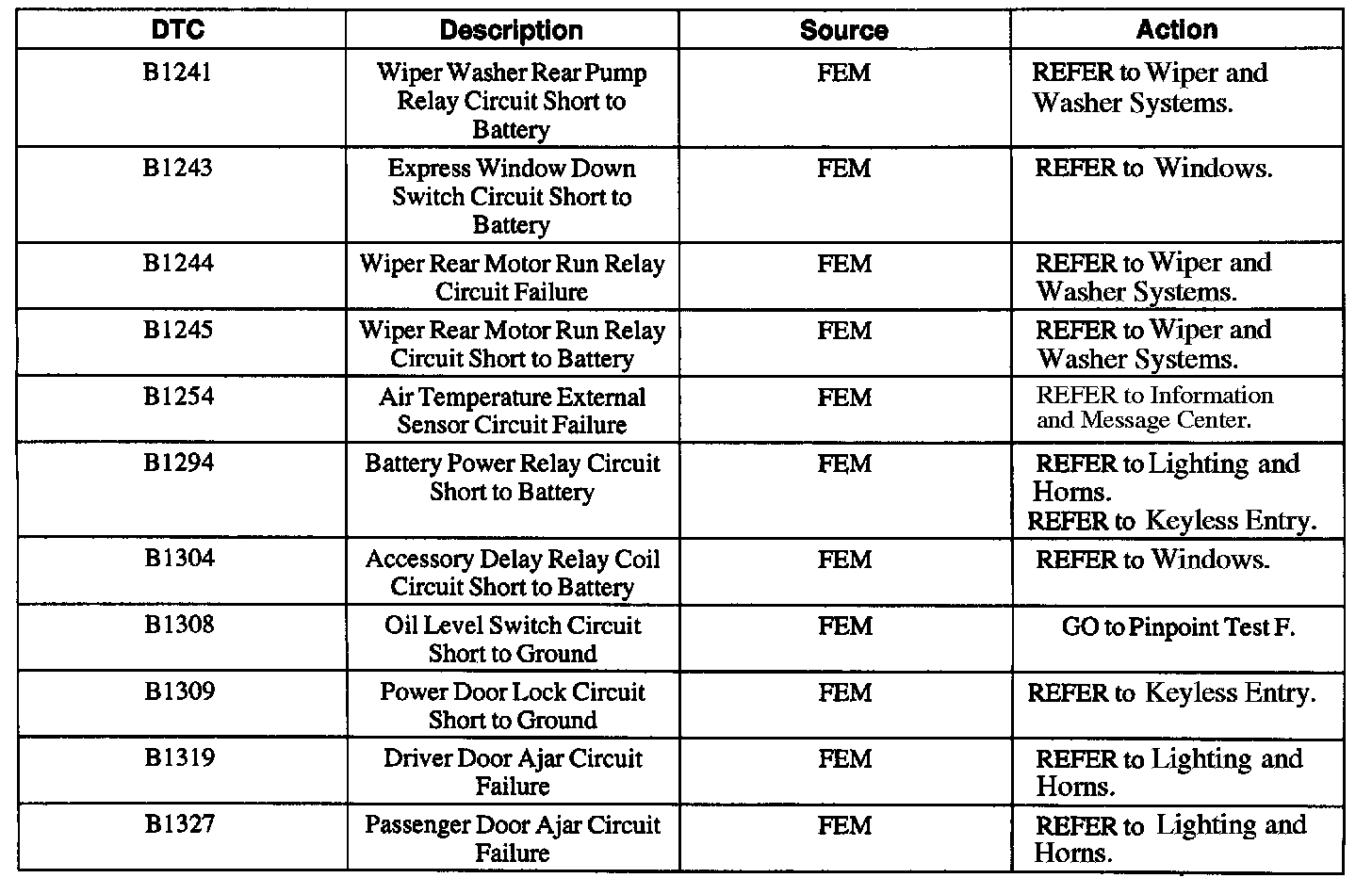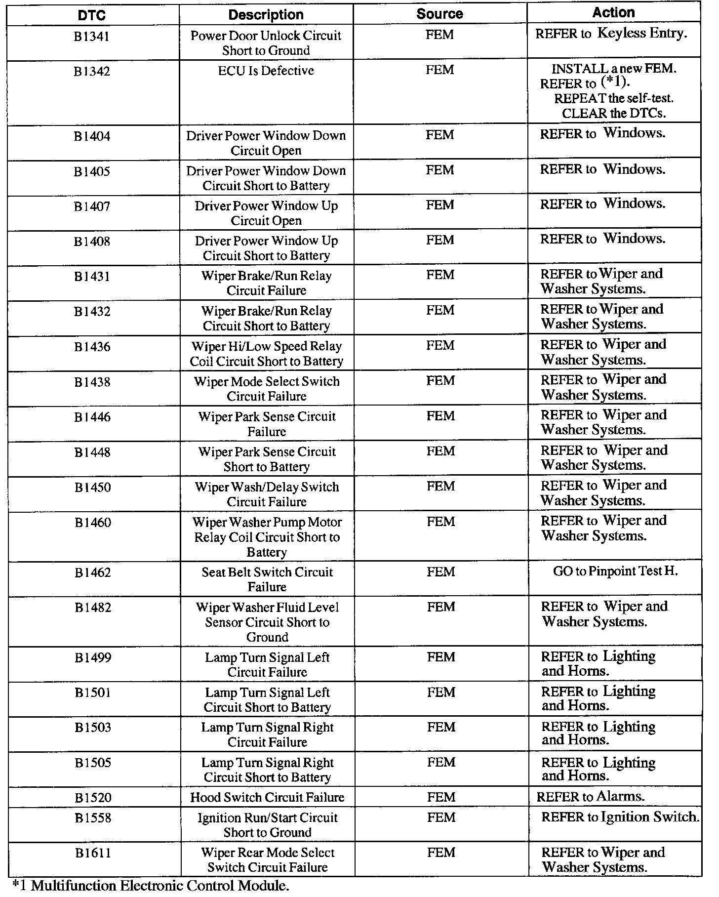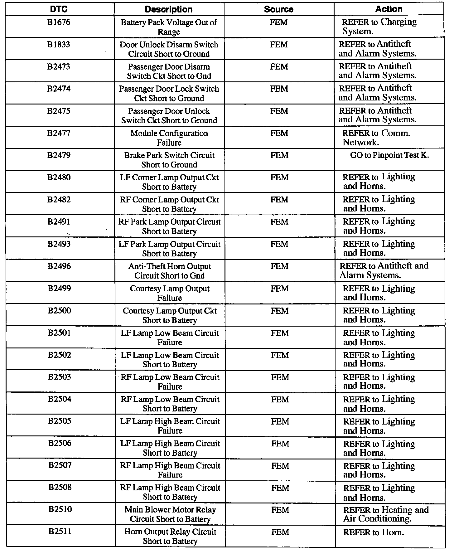 Front Electronic Module (FEM) Diagnostic Trouble Code (DTC) Index