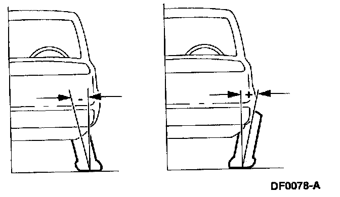 Camber, caster and toe are adjustable for the front suspension system. The front camber and caster are adjusted by first aligning the sub-frame and, if necessary, by resetting the alignment plates on the shock towers. The front toe is adjusted by the use of the front wheel spindle tie rod.Negative and Positive Camber: