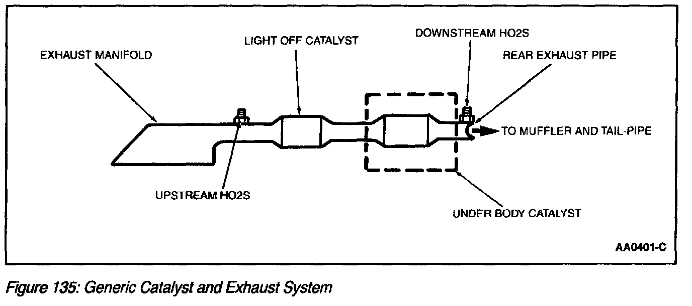 The downstream HO2S may be located after the light off catalyst or underbody catalyst. The underbody catalyst may be in-line with the light off catalyst, or the underbody catalyst may be common to two light off catalysts, forming a "Y" pipe configuration. For an exact configuration of the catalyst and exhaust system, refer to Exhaust System.
