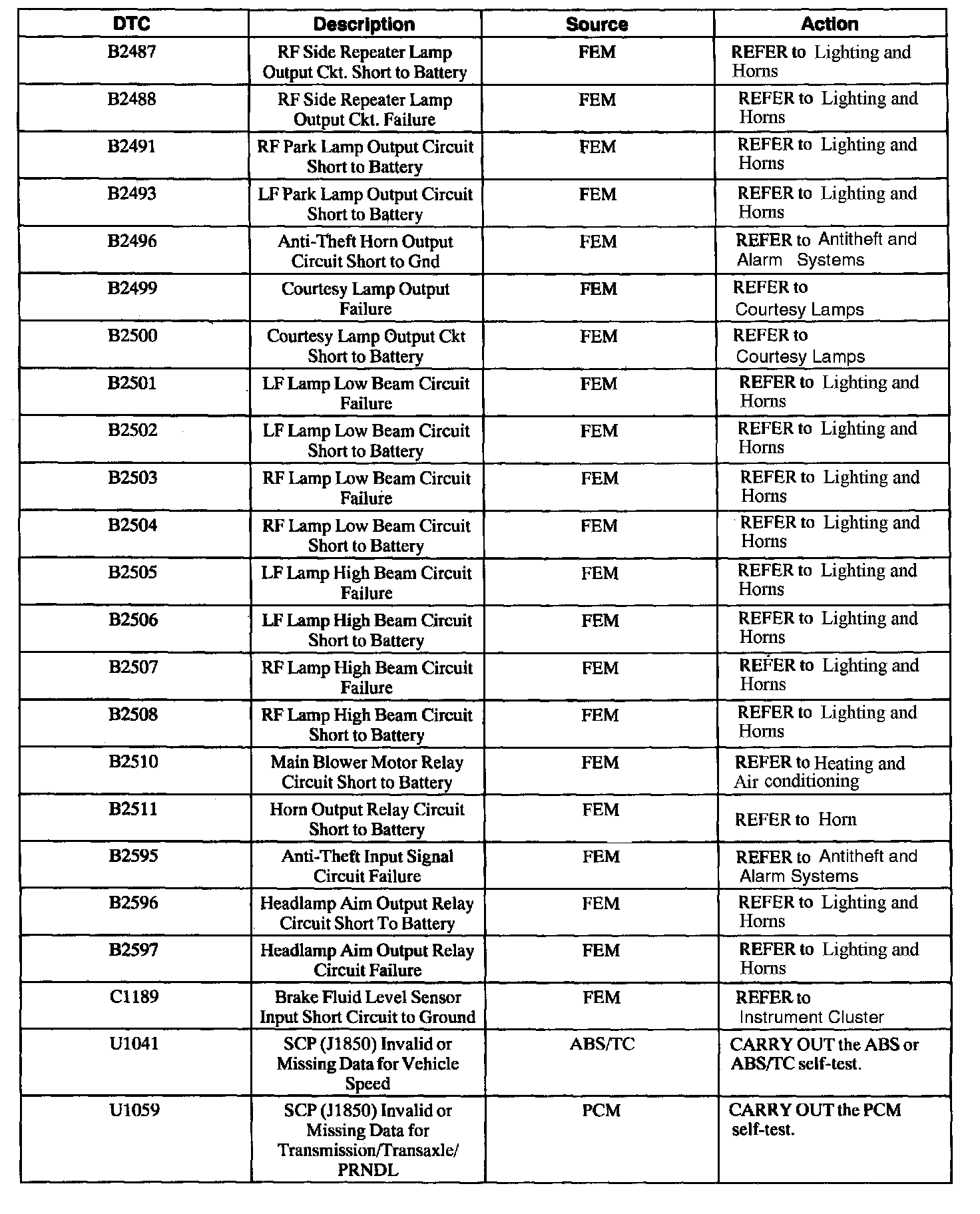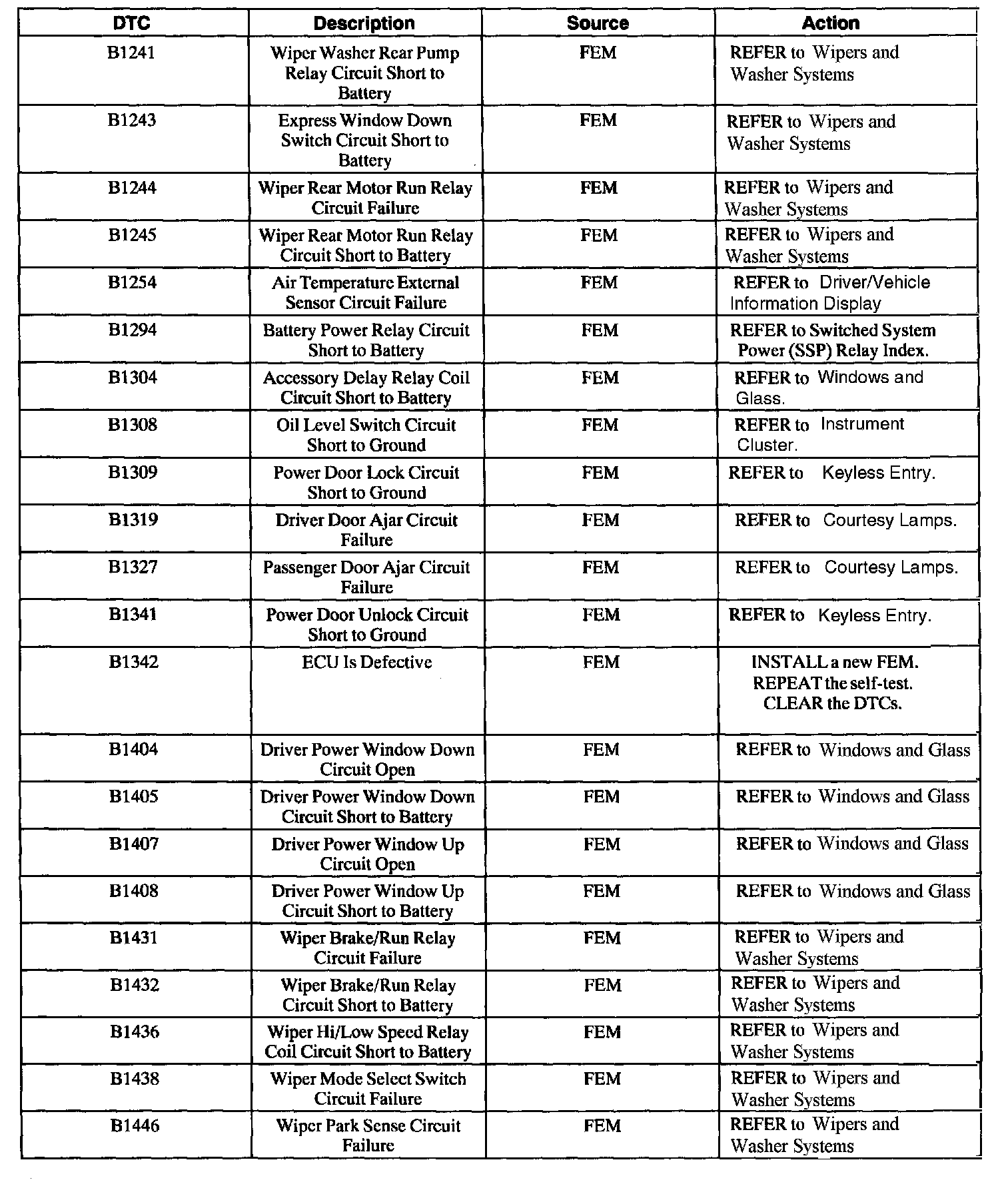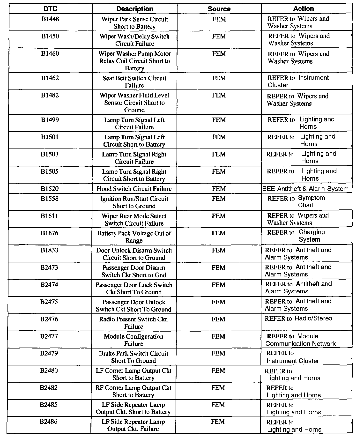 FEM Diagnostic Trouble Code (DTC) Index