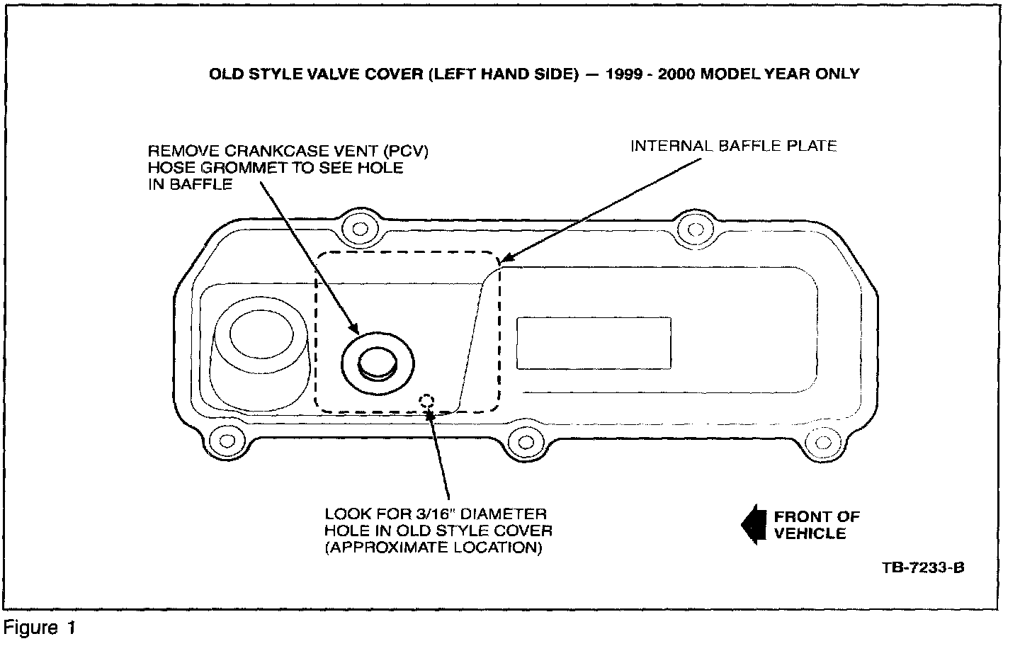 USING A SHOP LIGHT OR FLASHLIGHT, CHECK THE LH VALVE COVER TO SEE IF IT HAS ALREADY BEEN UPDATED TO THE LATEST LEVEL. REMOVE THE PCV VALVE AND RUBBER GROMMET FROM THE VALVE COVER AND LOOK THROUGH THE HOLE AT THE INTERNAL SHEET METAL BAFFLE. THE OLD STYLE VALVE COVER BAFFLE HAS A 3/16" DIAMETER HOLE IN THE 5:00 O'CLOCK POSITION AS YOU LOOK THROUGH THE PCV HOLE (FIGURE 1). VALVE COVERS FITTING THIS DESCRIPTION MUST BE REPLACED.