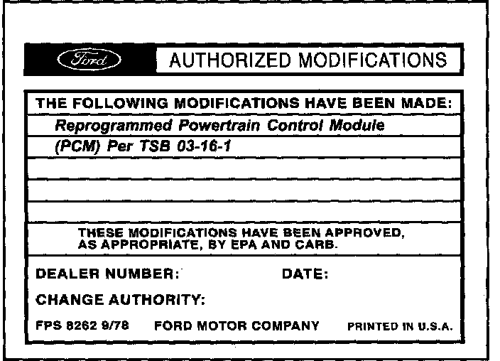 Obtain an Authorized Modifications Decal (FPS 8262 - obtainable through DOES II, 25/pkg) and list the date, dealer number, and summary of modifications performed. Select a prominent place adjacent to the Vehicle Emission Control Information Decal suitable for installing the Authorized Modifications Decal. Clean the area, install the decal, and cover it with a clear plastic decal shield.