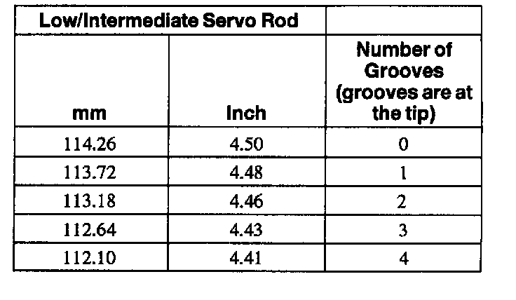 Back off the center screw until the piston movement stops and read the dial indicator. The reading should be within specification. If the reading does not match the specification, refer to the low/intermediate specification chart and determine which rod to use.