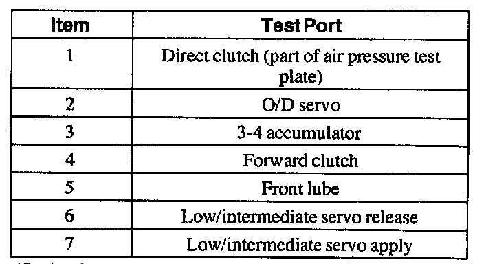 Note: When applying regulated 276 kPa (40 psi) air pressure to the appropriate passage, a dull noise should be heard when the clutch or band applies. There should be no hissing sound when the clutch or band applies.