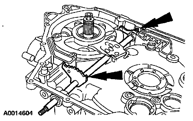 Note: The position of the manual valve detent lever is different than past models. The roll pin and shoulder point toward the driven sprocket support. Note the position of the lever during disassembly for correct assembly.