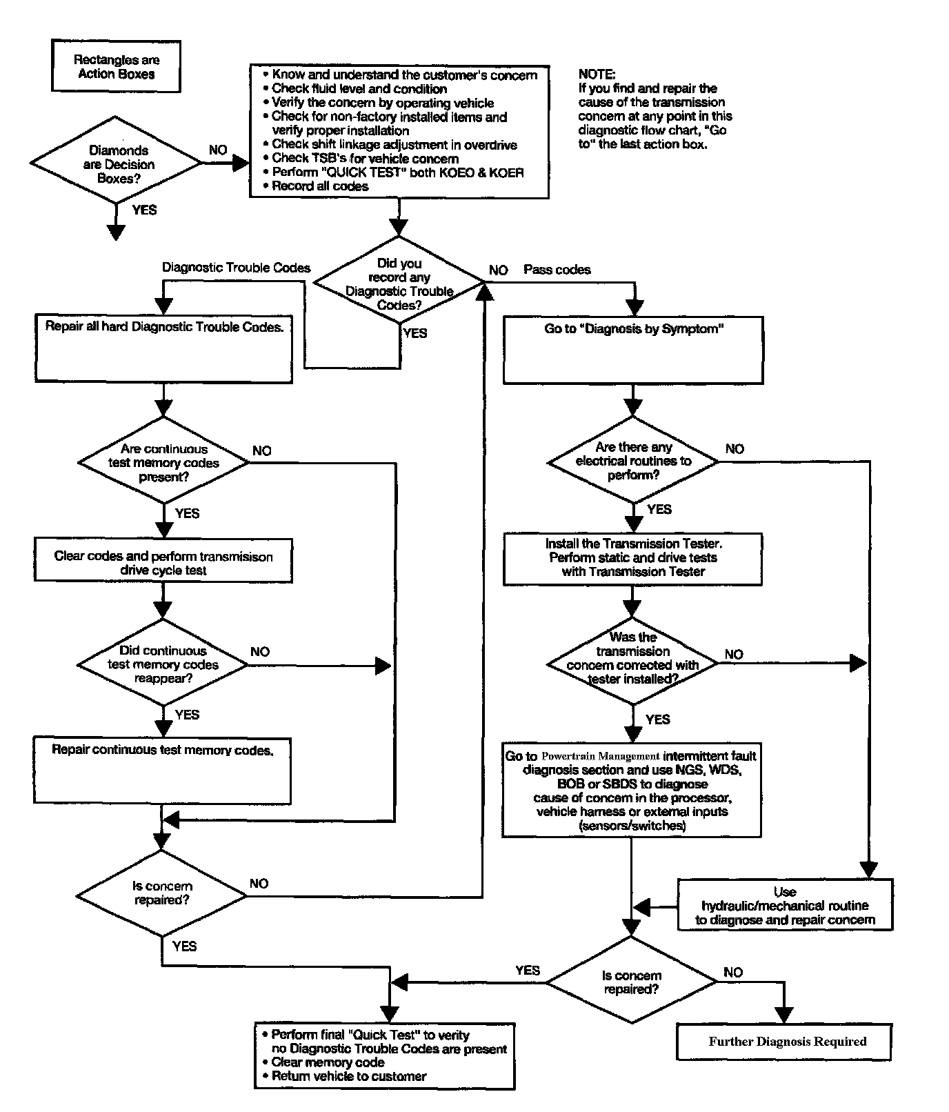 Troubleshooting an electronically controlled automatic transaxle is simplified by using the proven method of diagnosis. One of the most important things to remember is that there is a definite procedure to follow.Note: Do not take shortcuts or assume that critical checks or adjustments have already been made. Follow the procedures as written to avoid missing critical components or steps.