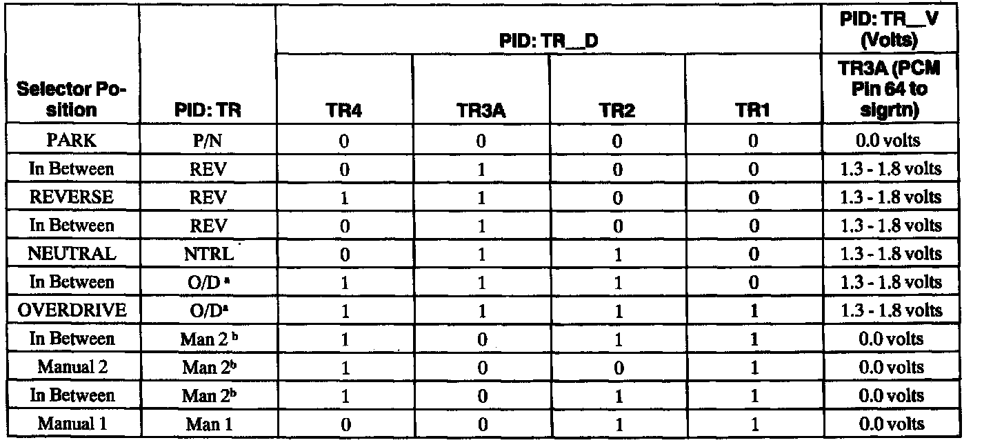 1.8 - 5.0 volts=Invalid Reading (open in wires or bad resistor in digital TR sensor).