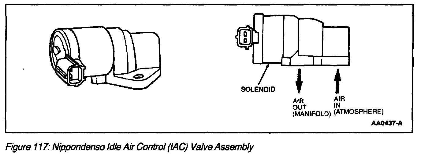 The Idle Air Control (IAC) valve assembly (Figure 117) and (Figure 118) controls engine idle speed and provides a dashpot function. The IAC valve assembly meters intake air around the throttle plate through a bypass within the IAC valve assembly and throttle body. The PCM determines the desired idle speed or bypass air and signals the IAC valve assembly through a specified duty cycle. The IAC valve responds by positioning the IAC valve to control the amount of bypassed air. The PCM monitors engine rpm and increases or decreases the IAC duty cycle in order to achieve the desired rpm.