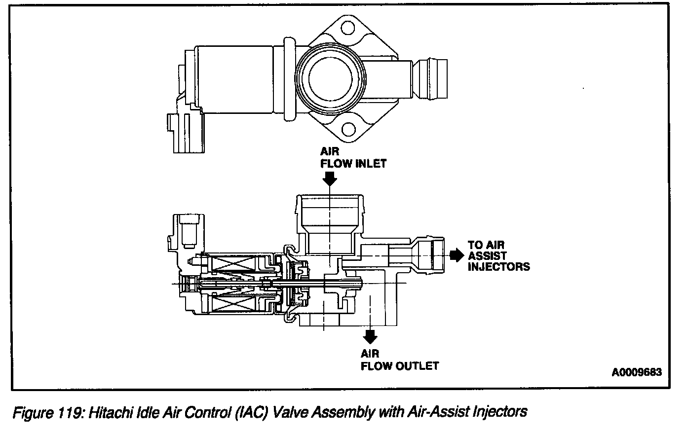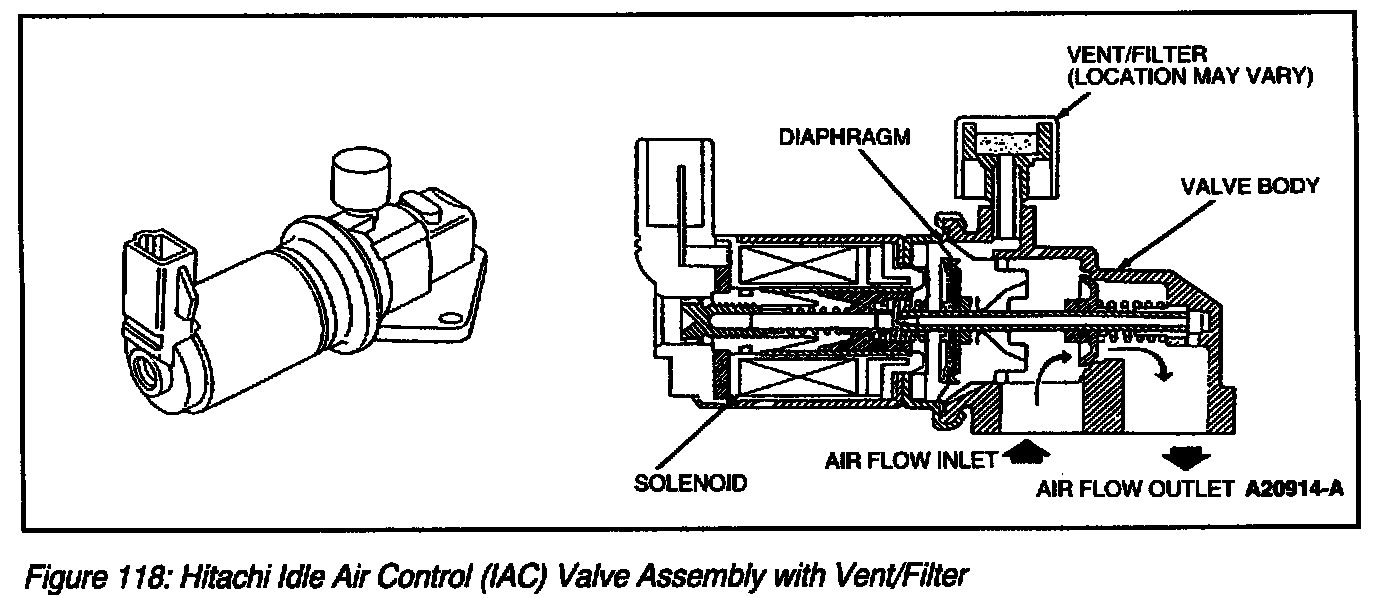 On applications with air-assisted injectors, the IAC valve (Figure 119) also supplies a small amount of air into the path of the fuel injectors. The jet of air causes an increase in fuel atomization at low speed and light load conditions.