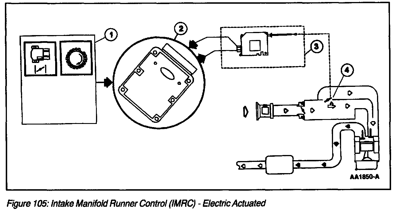 The Intake Manifold Runner Control (IMRC) Electric Actuated system (Figure 105) consists of a remote mounted motorized actuator with an attaching cable for each housing on each bank. Some applications will use one cable for both banks. The cable or linkage attaches to the housing butterfly plate levers. The 2.0L (2V) Focus/Escort IMRC uses a motorized actuator mounted directly to a single housing without the use of a cable. Each IMRC housing is an aluminum casting with two intake air passages for each cylinder. One passage is always open and the other is opened and closed with a butterfly valve plate. The housing uses a return spring to hold the butterfly valve plates closed. The motorized actuator houses an internal switch or switches, depending on the application, to provide feedback to the Powertrain Control Module (PCM) indicating cable and butterfly valve plate position.