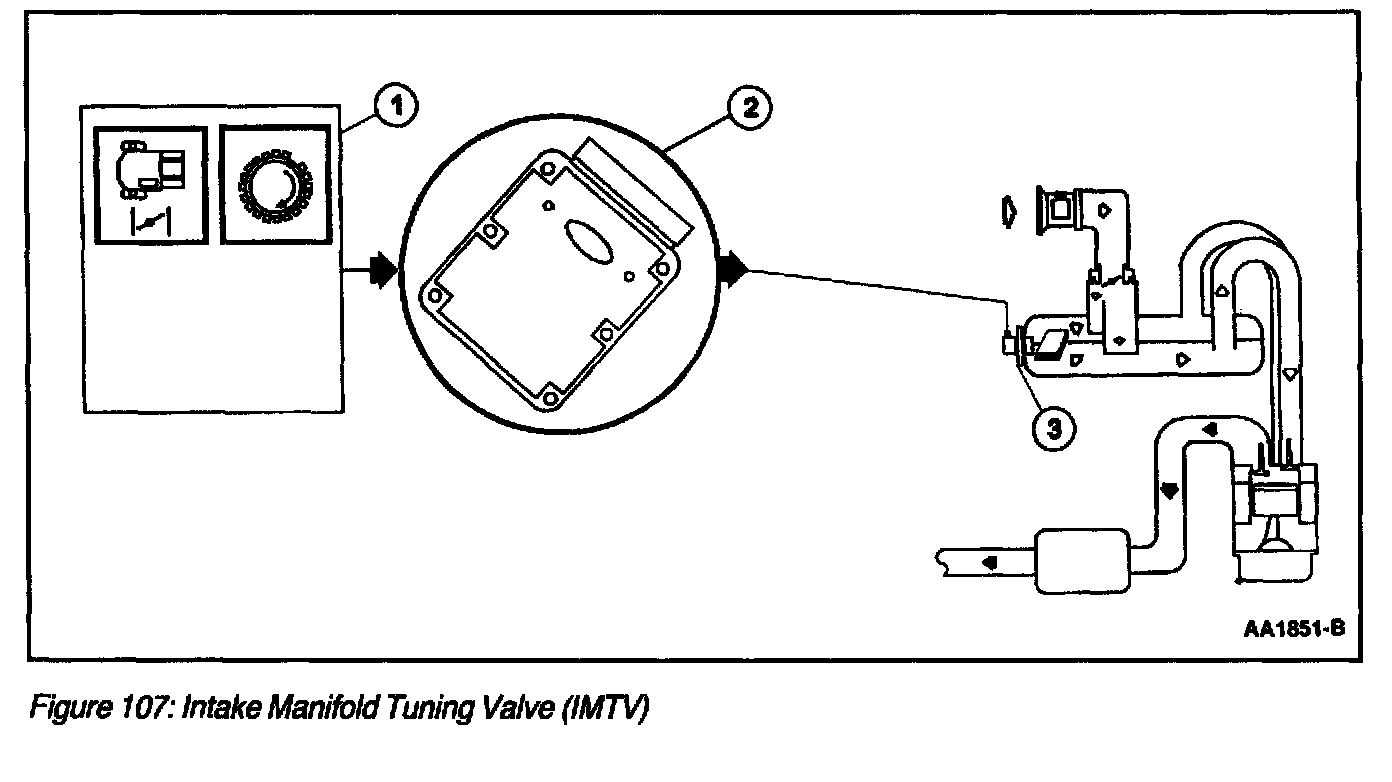 The Intake Manifold Tuning Valve (IMTV) (Figure 107) is a motorized actuated unit mounted directly to the intake manifold. The IMTV actuator controls a shutter device attached to the actuator shaft. There is no monitor input to the PCM with this system to indicate shutter position.