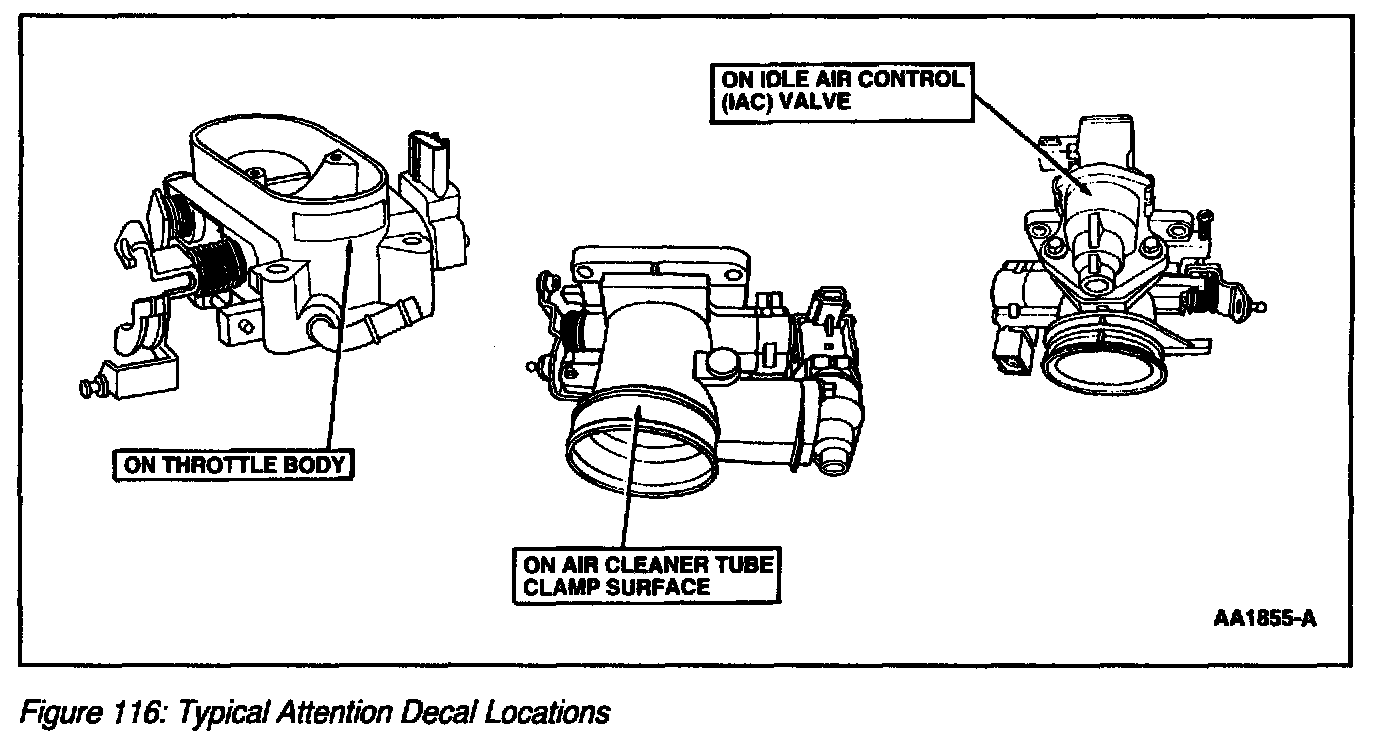 7. A sealant/coating on the throttle bore and throttle plate makes the throttle body air flow tolerant to engine intake sludge accumulation. These throttle body assemblies MUST NOT BE CLEANED and have a white/black attention decal (Figure 116) advising not to clean.