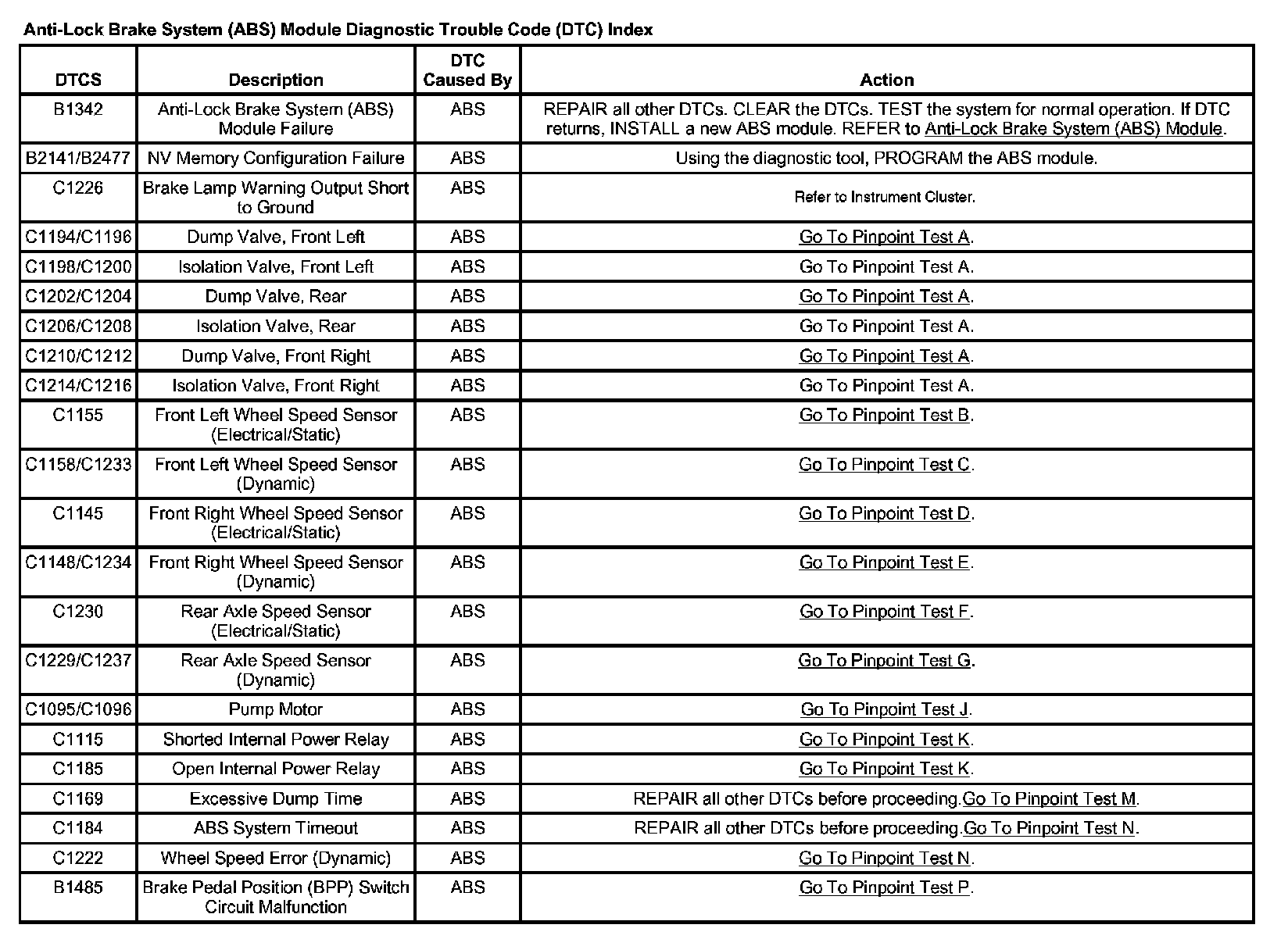 Anti-Lock Brake System (ABS) Module Diagnostic Trouble Code (DTC) Index