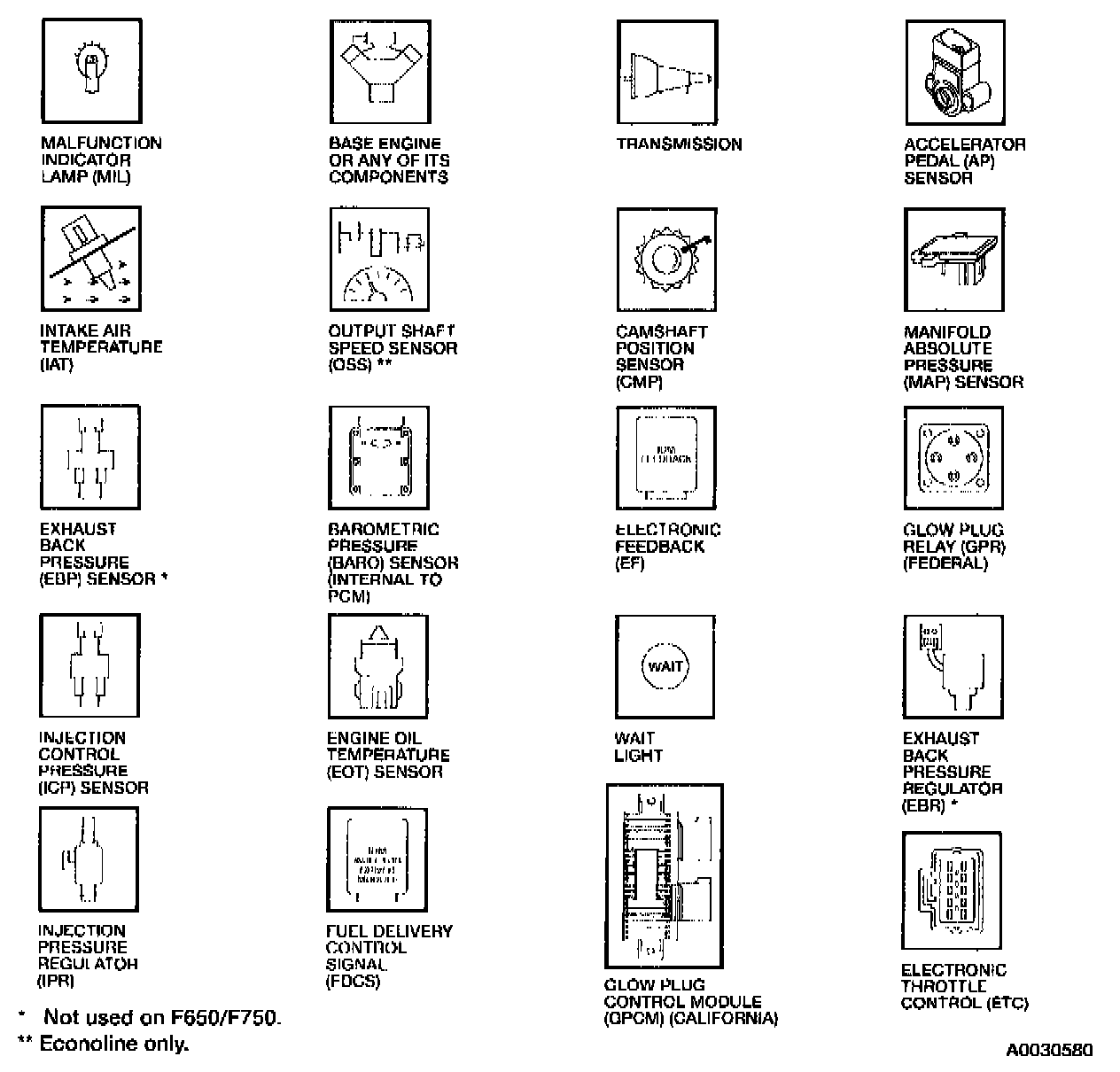 5. Unlike Ford gasoline vehicles, the OBD II command to Clear Codes will ONLY clear the OBD II system. Clearing codes from the vehicle specific menu will clear BOTH the manufacturer/vehicle specific codes and the OBD II codes. These icons are used in the illustrations of the OBD II monitors.