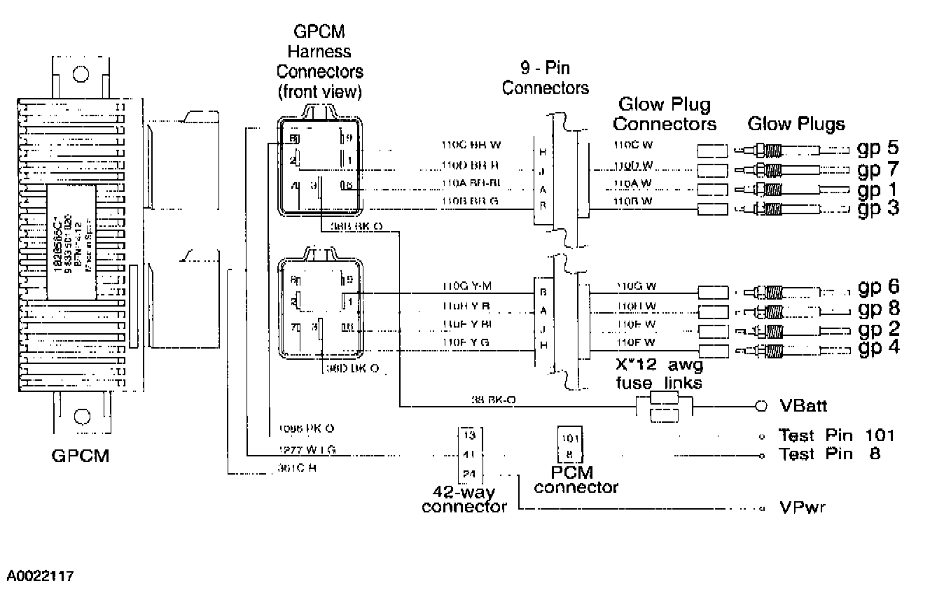 A diesel engine calibrated for California vehicles under 14,000 GVW and all Excursion vehicles utilize a Glow Plug Monitor (GPM) system designed to locate failed glow plugs or failed wiring in the glow plug system. Diagnostic Trouble Codes (DTCs) indicate which bank has failed glow plugs or failed glow plug wiring.