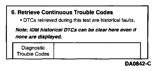 NOTE: The IDM stores both historical and hard IDM fault codes. To retrieve IDM fault codes, you must run KOEO On-Demand Self Test or KOEO Injector Electrical Test. To ensure that the DTC is a hard fault, you must first clear Continuous DTCs (be sure to record all DTCs before clearing) even though IDM codes do not show up on the Continuous display.