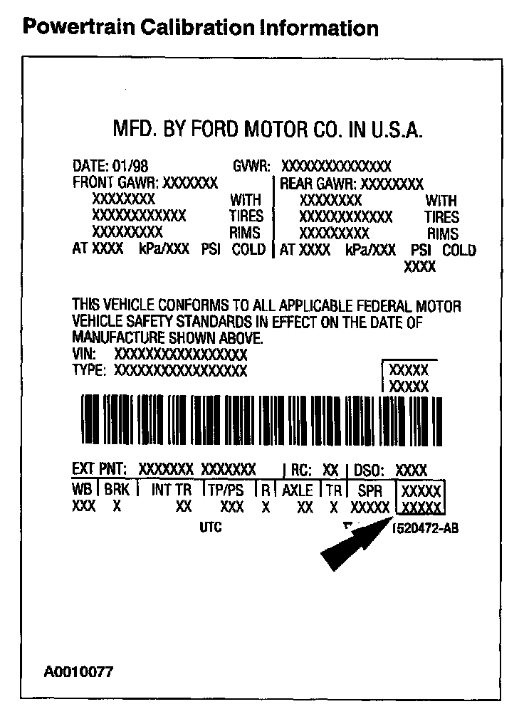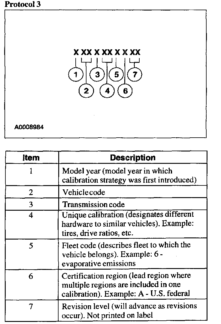 Powertrain calibration information is printed in the lower right corner of the vehicle certification label. Only the base calibration information is printed. Revision levels will not appear, however, this information can be found in On Line Automotive Service Information System (OASIS). For the current model year, Ford Motor Company is using three different protocols which describe powertrain base calibration. These protocols are designed to provide worldwide standardization for vehicle calibration. If the electronic calibration strategy has been used since 1998 and carried into the current model year, Protocol 1 will be used. Refer to Protocol 1 below. If the electronic calibration strategy has been used since 1999 and is carried into the current model year, Protocol 2 will be used. Refer to Protocol 2 below. Electronic calibration strategies introduced in the 2000 or 2001 model year will use Protocol 3. Refer to Protocol 3 below.