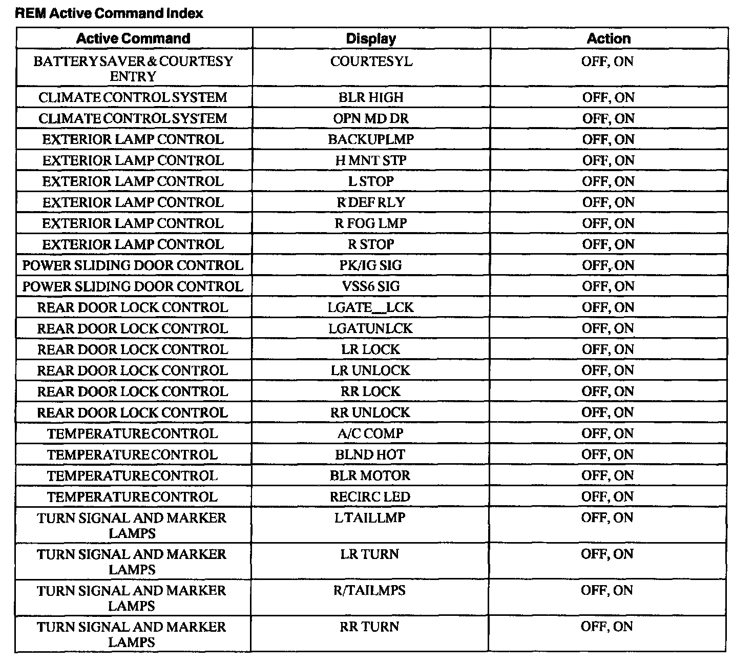 Rear Electronic Module (REM) Active Command Index