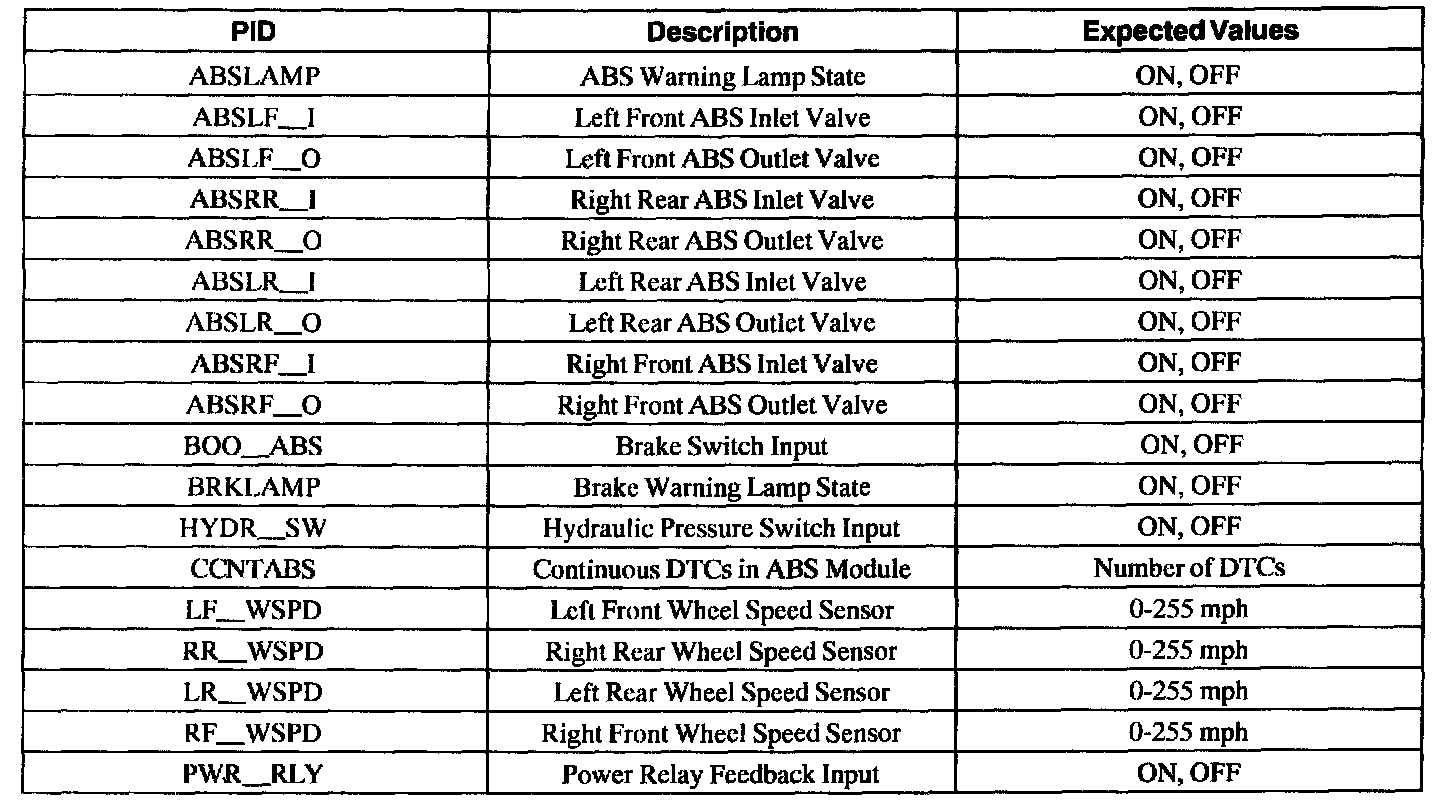 ABS Control Module Parameter Identification (PID) Index