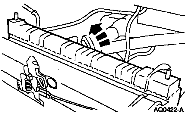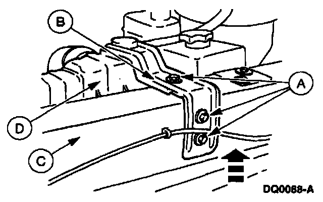 13. Remove the (A) bolts retaining the (B) support brackets to the (C) radiator support. Lift the radiator support brackets upwards and away from the (D) radiator.