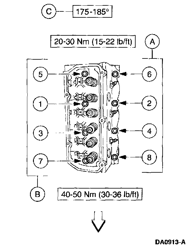 In the sequence shown, loosen the bolt three turns, then tighten the (A) short bolt or (B) long bolt to the specification indicated, and then further tighten the bolt to the (C) degrees indicated.