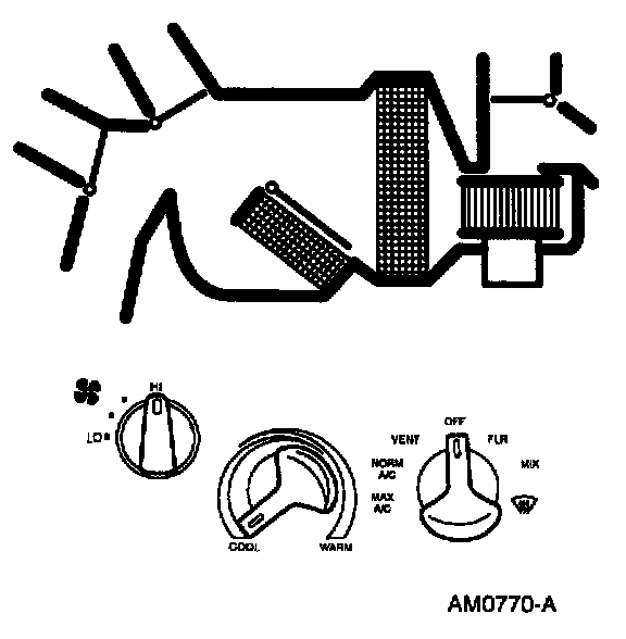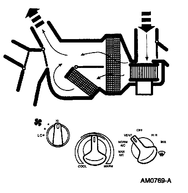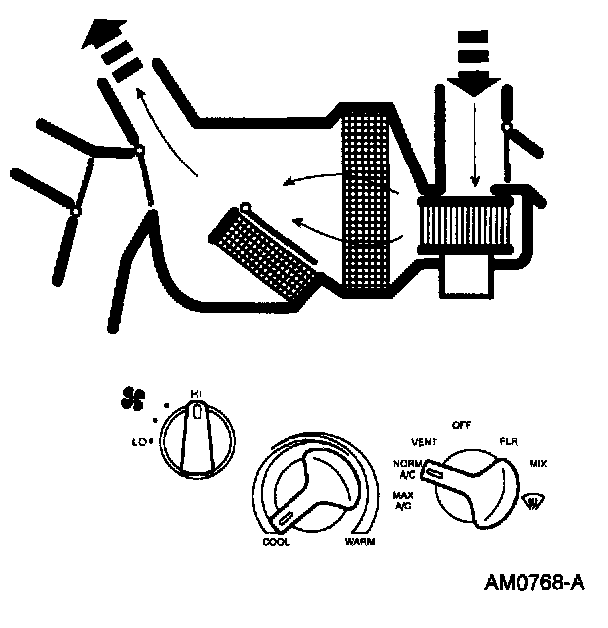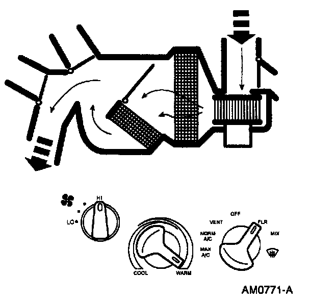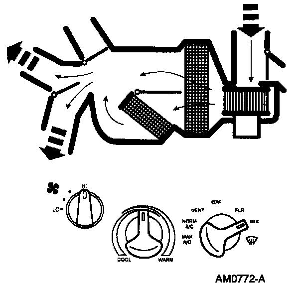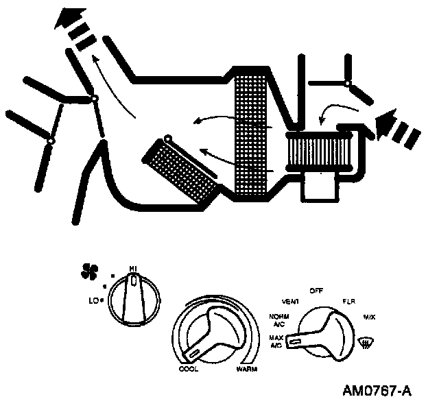 ^ The temperature can be adjusted to mix air flowing through and around the heater core to achieve the desired temperature level.