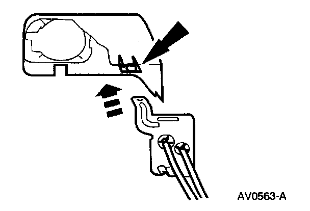 ^ Compress the retaining tabs and remove the accelerator cable from the accelerator cable bracket.