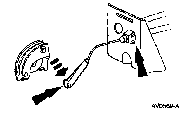 ^ Compress the retaining tabs on the speed control actuator cable and remove the speed control actuator cable from the accelerator cable bracket.