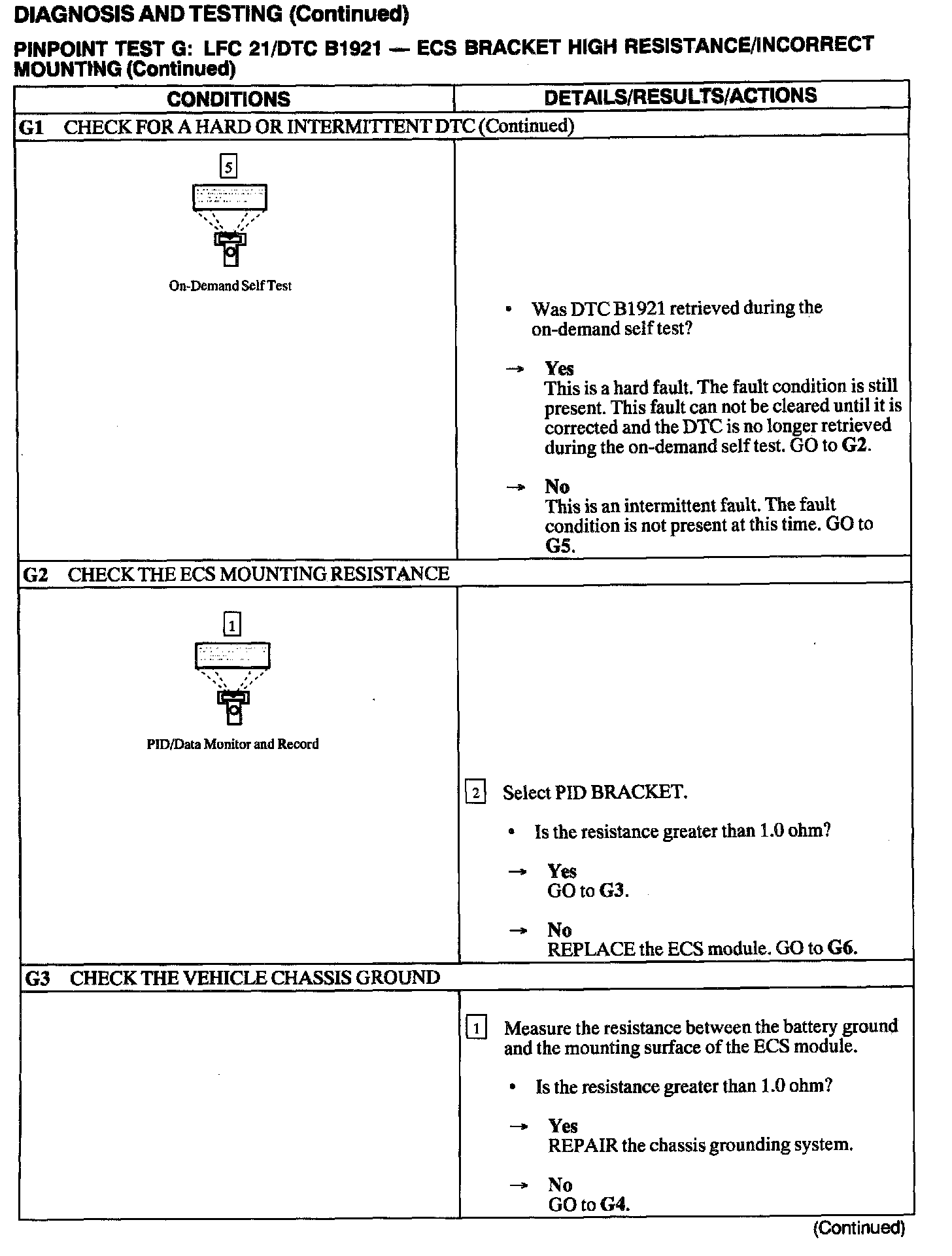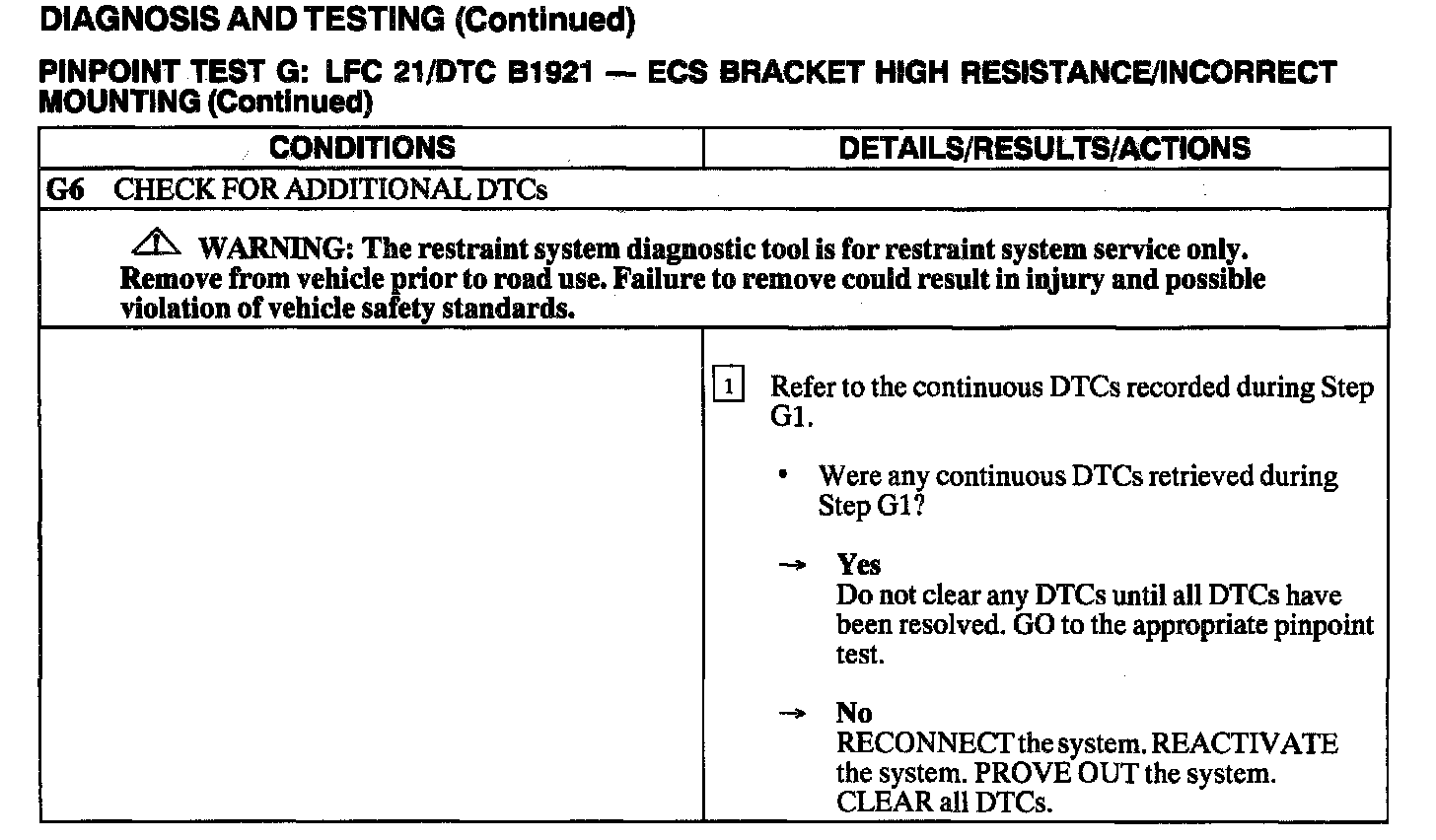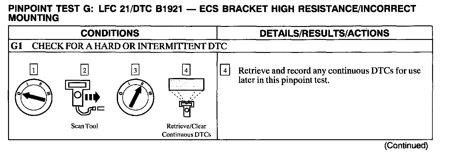 The air bag Electronic Crash Sensor (ECS) module monitors the resistance between the ground connection at its housing and the reference ground at Pins C2041-18 and C2041-21. If the ECS detects a resistance greater than 1.0 ohm, the ECS will store DTC B1921 in memory and flash LFC 21 (or higher priority code if one exists) on the air bag indicator.
