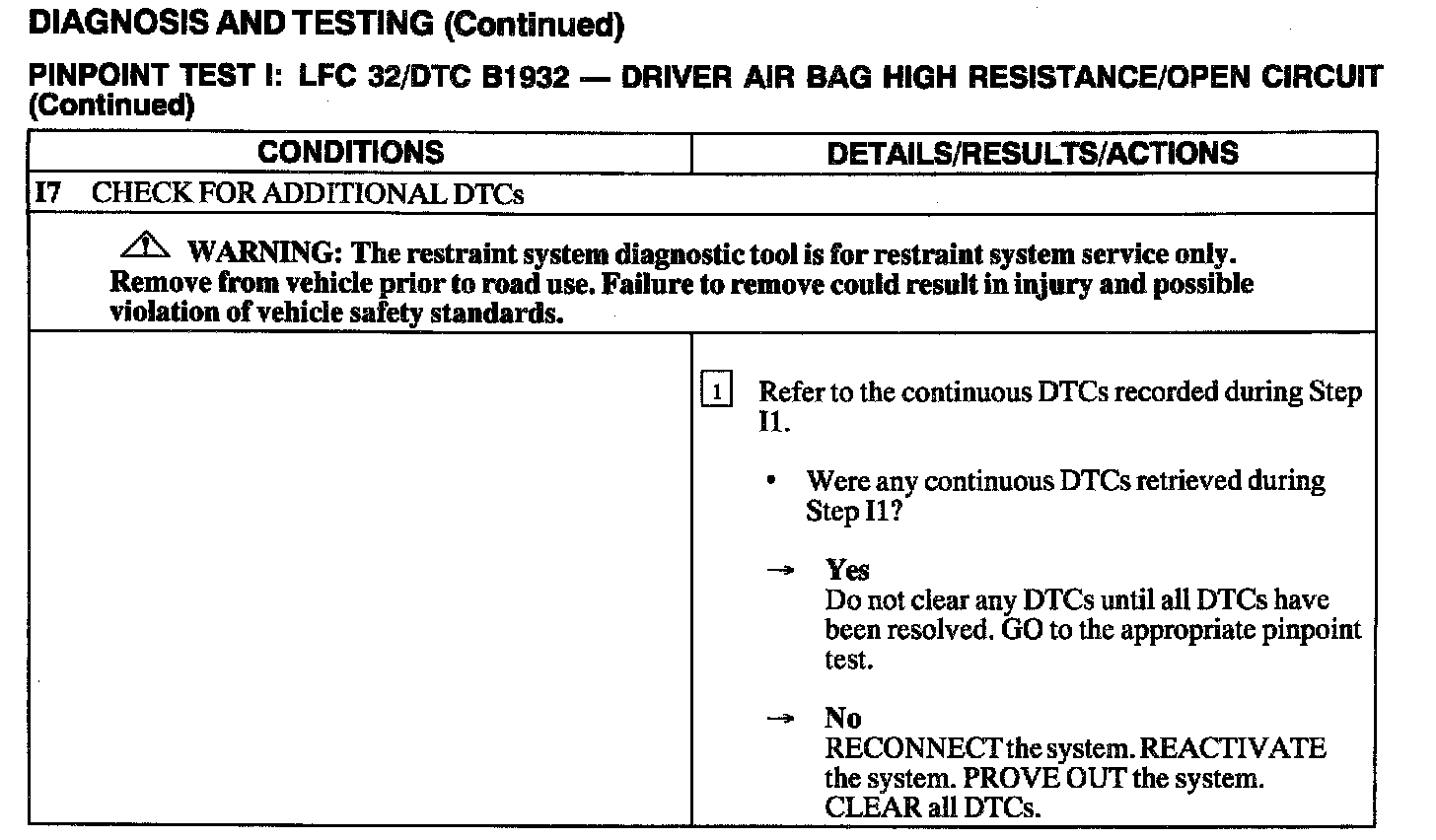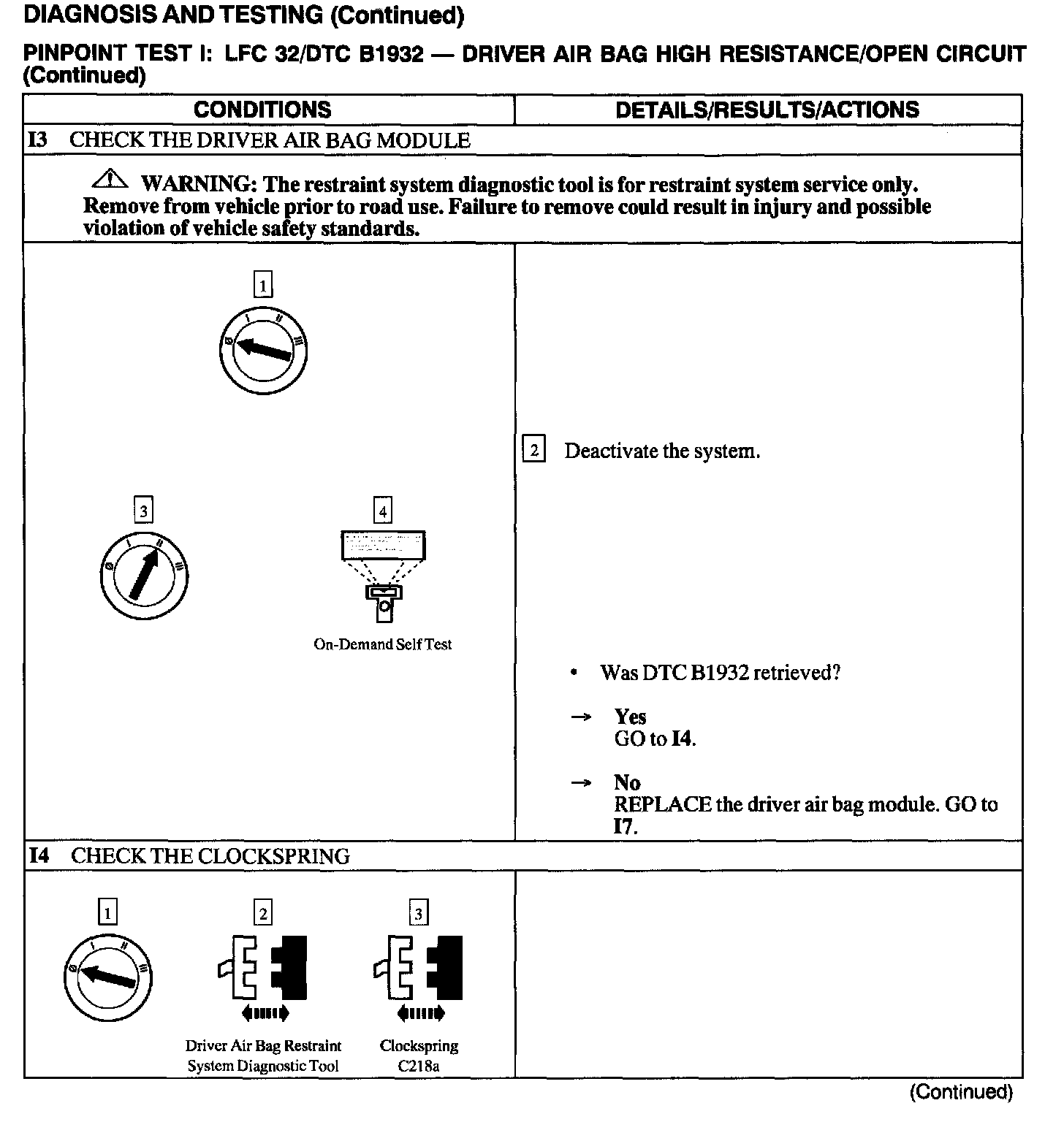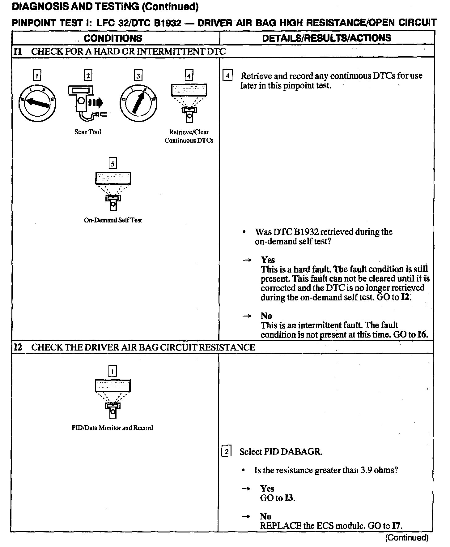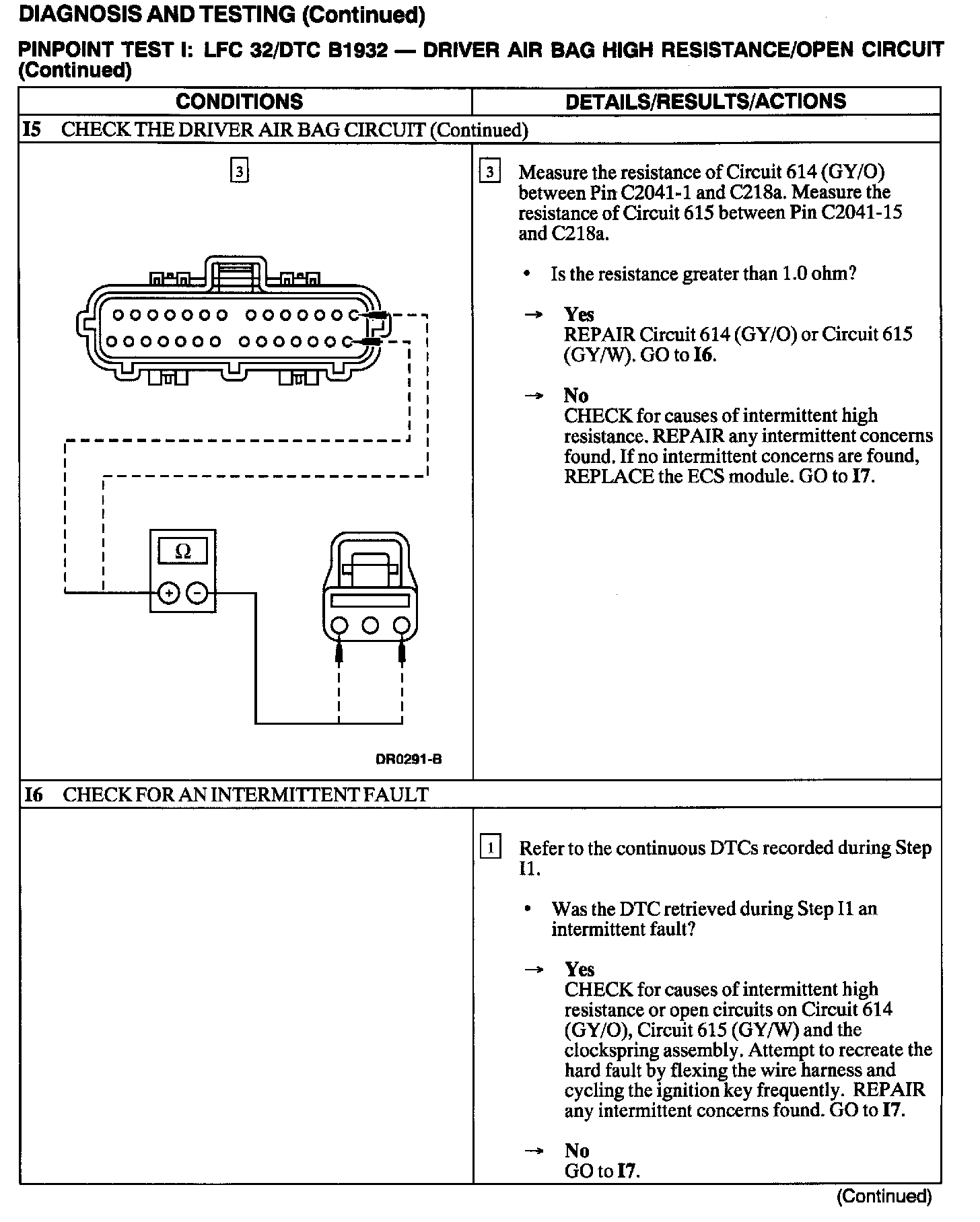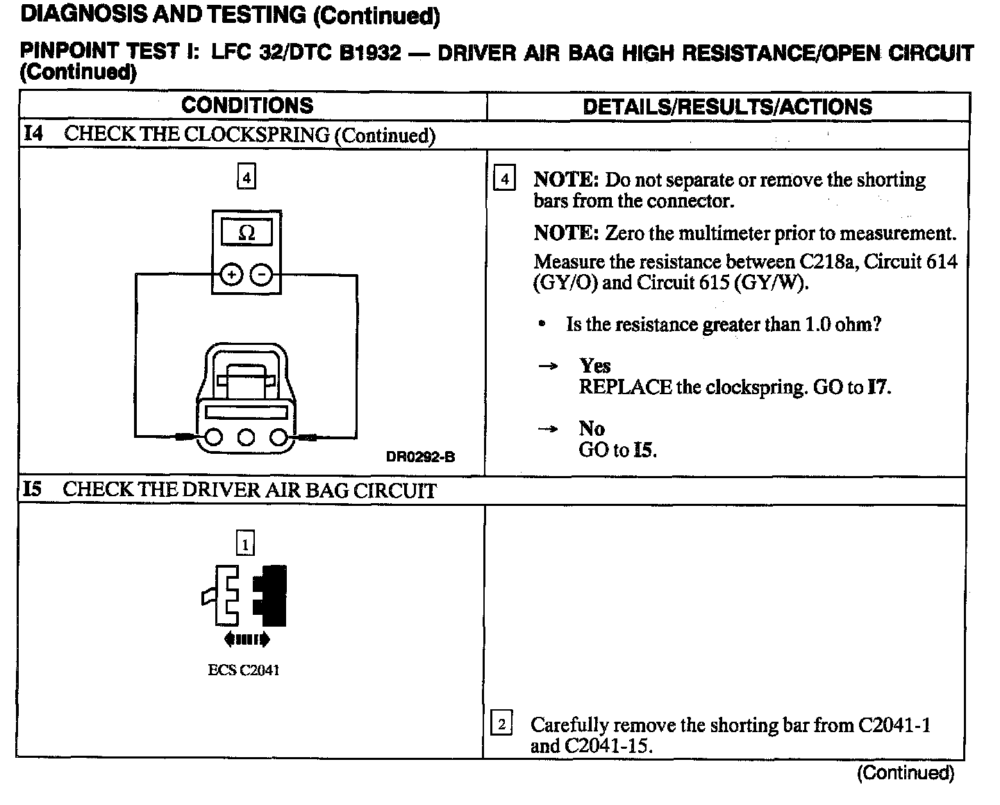 The air bag Electronic Crash Sensor (ECS) monitors the resistance of the driver air bag ignitor by measuring the resistance between Pins C2041-1 and C2041-15. If the ECS detects high resistance, the ECS will store DTC B1932 in memory and flash LFC 32 (or higher priority code if one exists) on the air bag indicator.