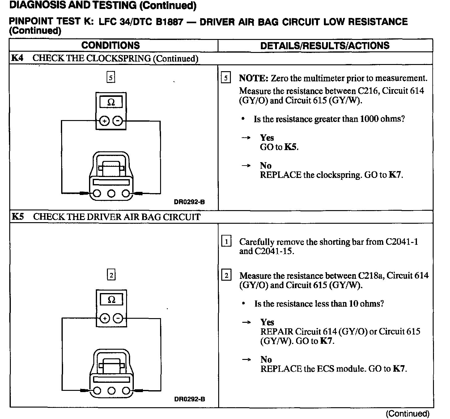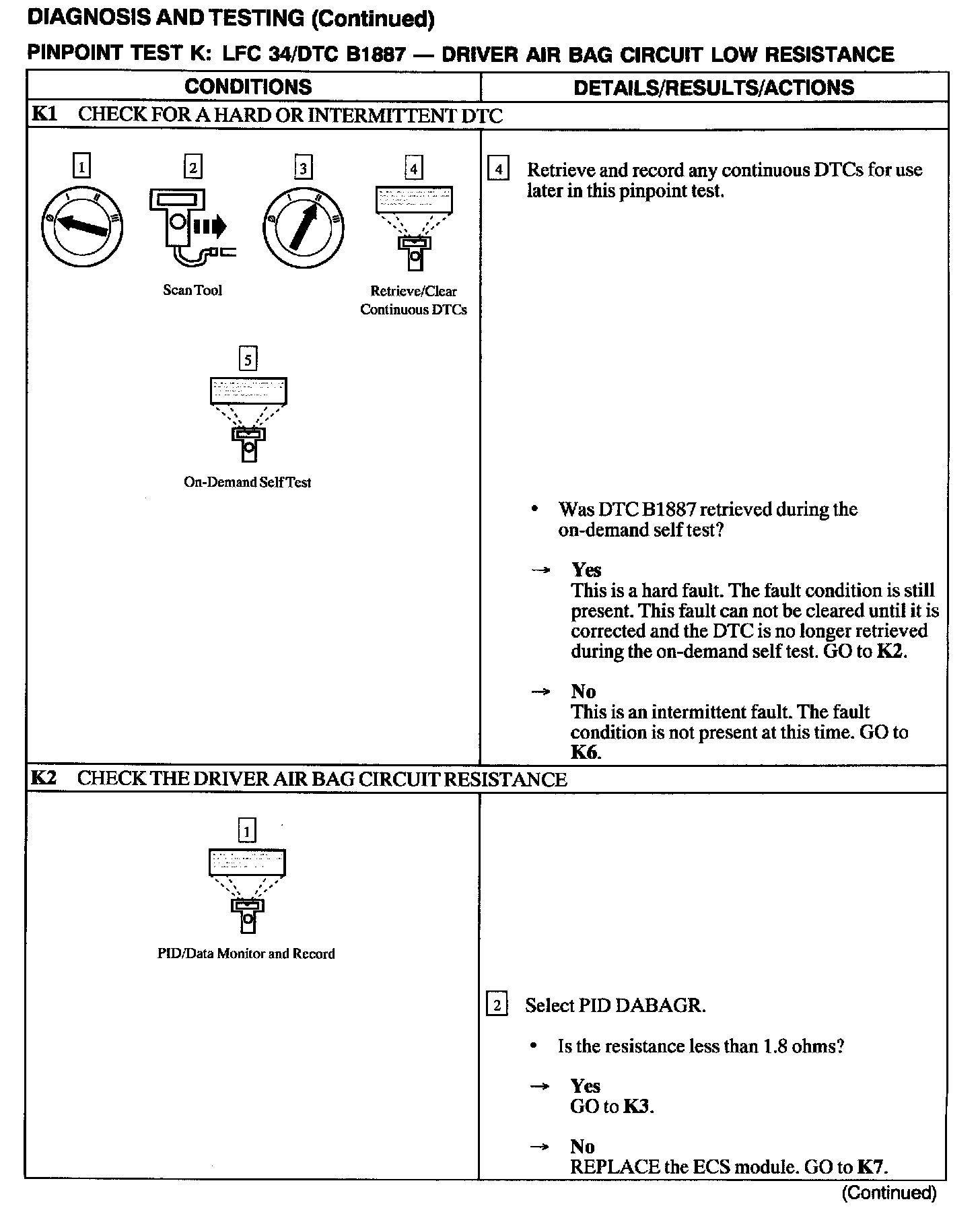 The air bag Electronic Crash Sensor (ECS) module monitors the resistance of the driver air bag ignitor by measuring the resistance between Pins C2041-1 and C2041-15. If the ECS detects low resistance, the ECS will store DTC B1887 in memory and flash LFC 34 (or higher priority code if one exists) on the air bag indicator.