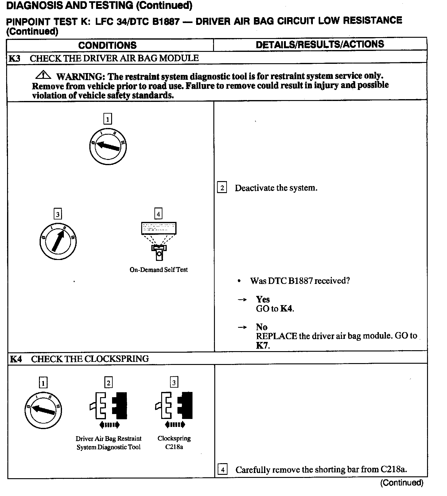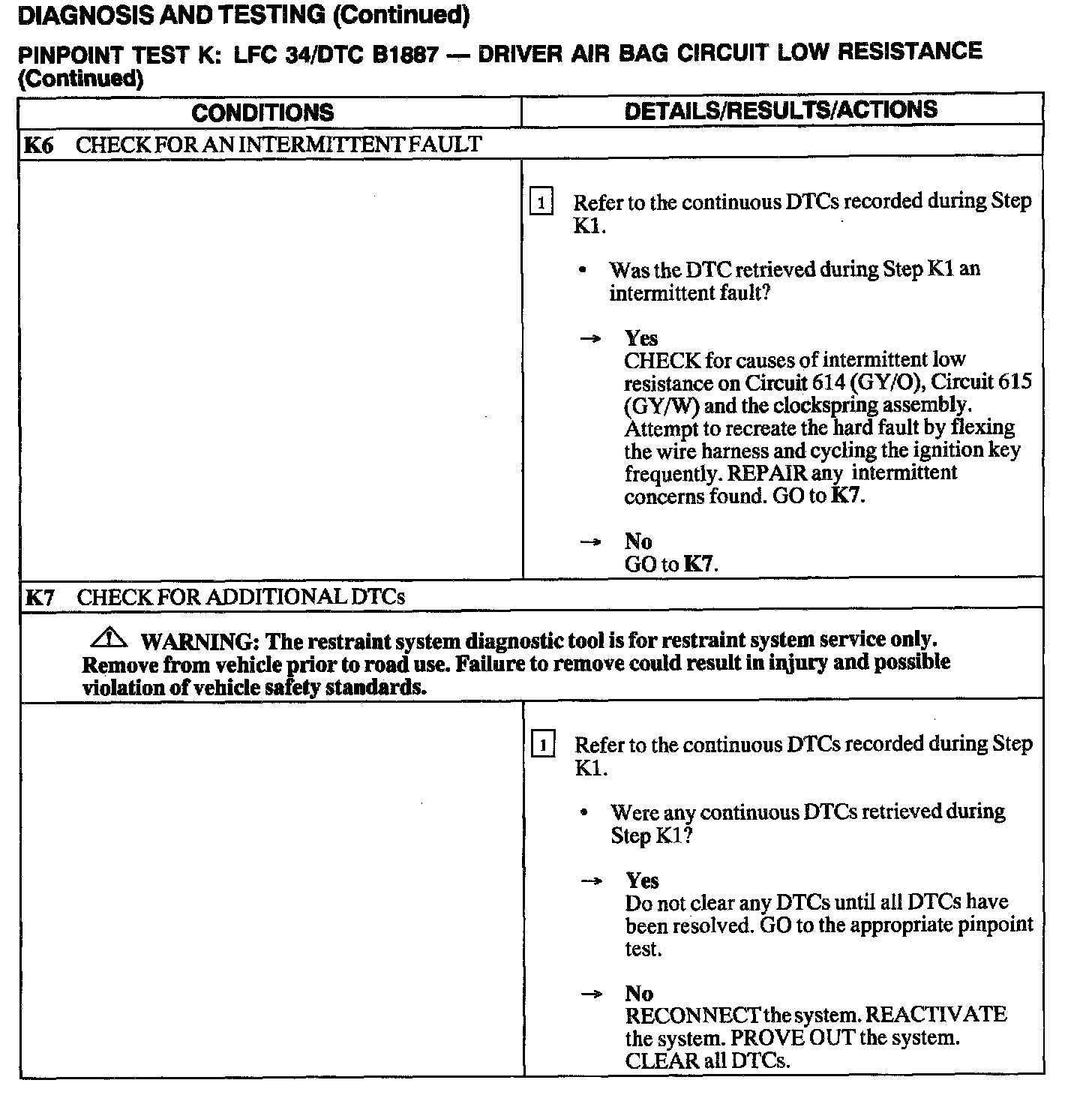 WARNING: DO NOT ATTEMPT A DIRECT RESISTANCE MEASUREMENT OF THE AIR BAG MODULE. A DIRECT RESISTANCE MEASUREMENT OF THE AIR BAG MODULE CAN CAUSE AIR BAG DEPLOYMENT, WHICH CAN RESULT IN PERSONAL INJURY. FOLLOW THE DIAGNOSTIC PROCEDURE TO DETERMINE IF THE AIR BAG MODULE RESISTANCE IS LOWER THAN NORMAL.