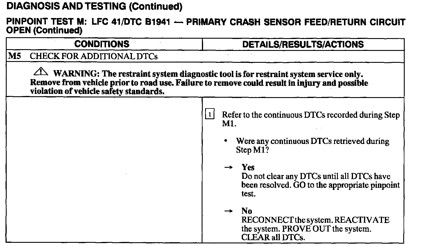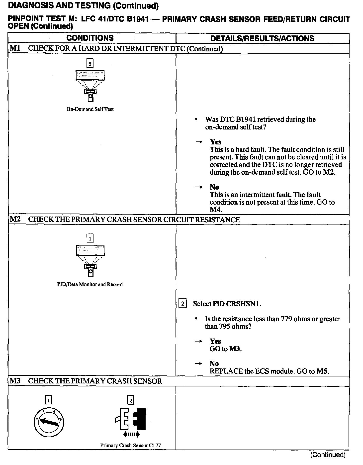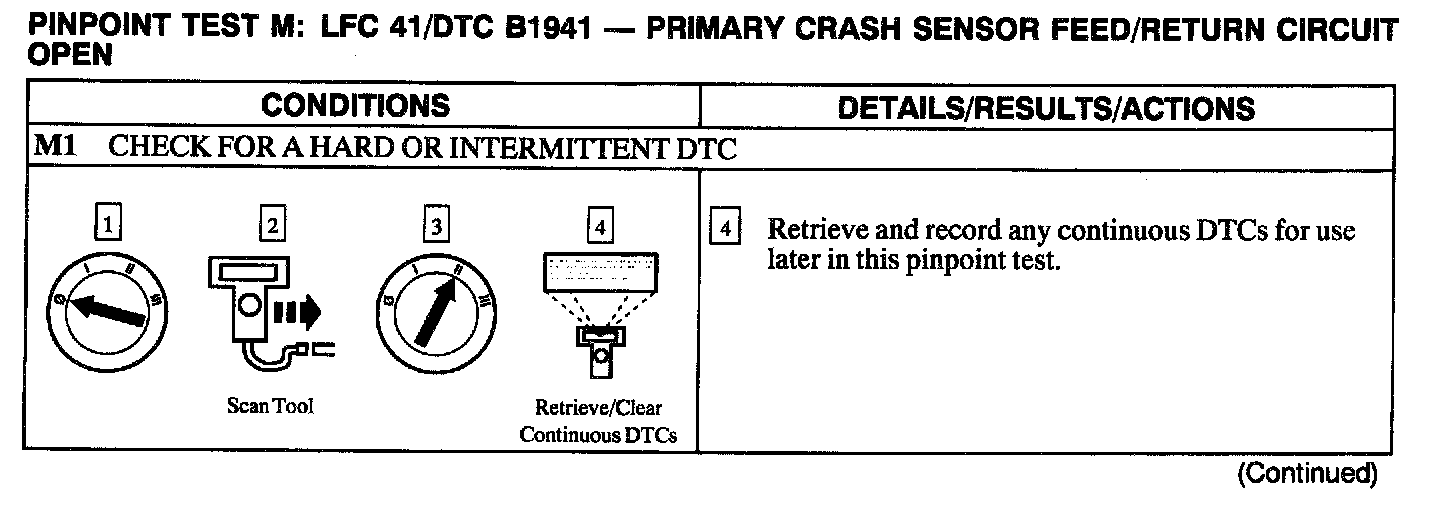 The air bag Electronic Crash Sensor (ECS) monitors the resistance of the primary crash sensor circuit by measuring the resistance between Pin C2041-6 and ground (C2041-18 or C2041-21). If the ECS detects low or high resistance, the ECS will store DTC B1941 in memory and flash LFC 41 (or higher priority code if one exists) on the air bag indicator.