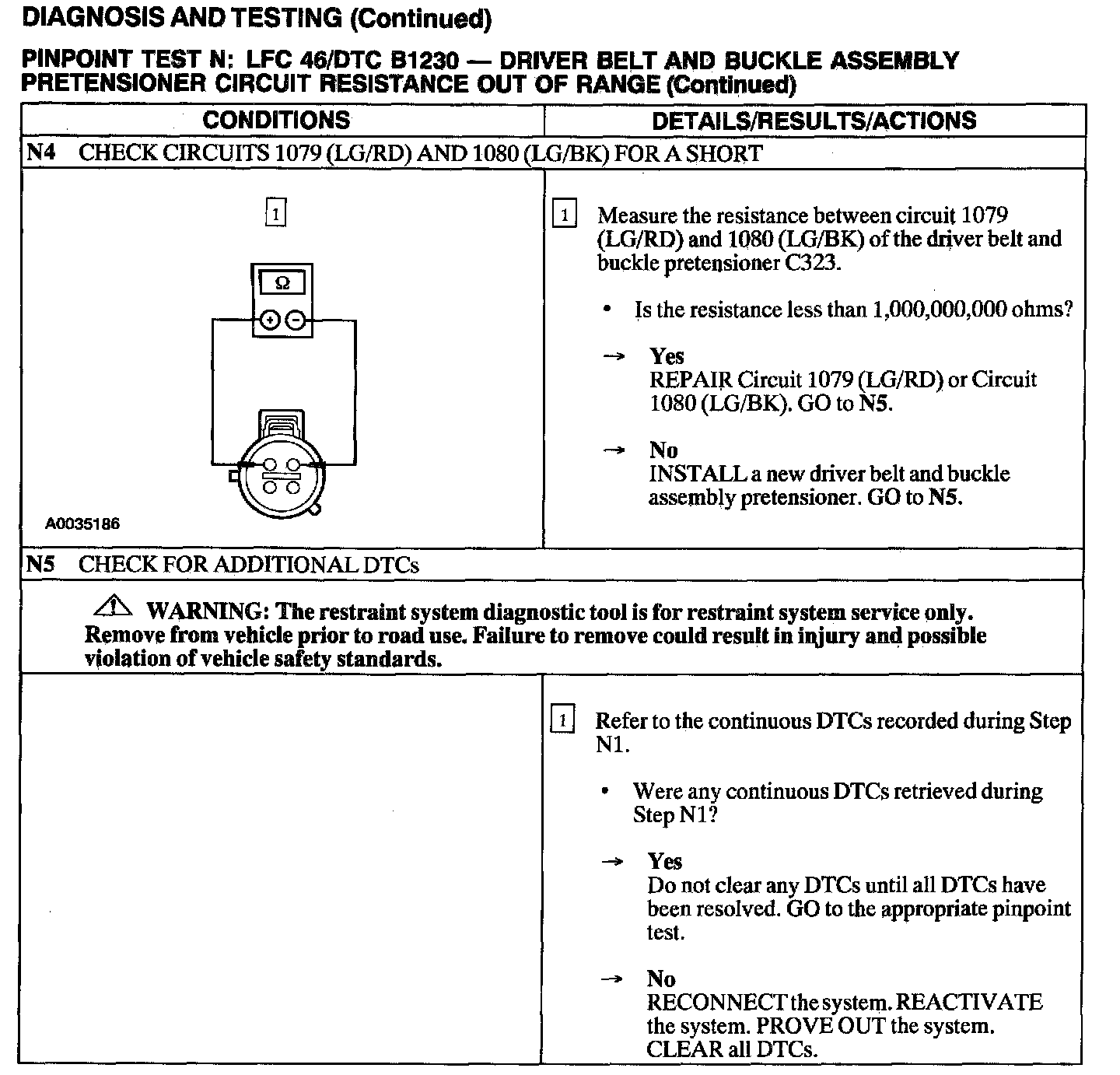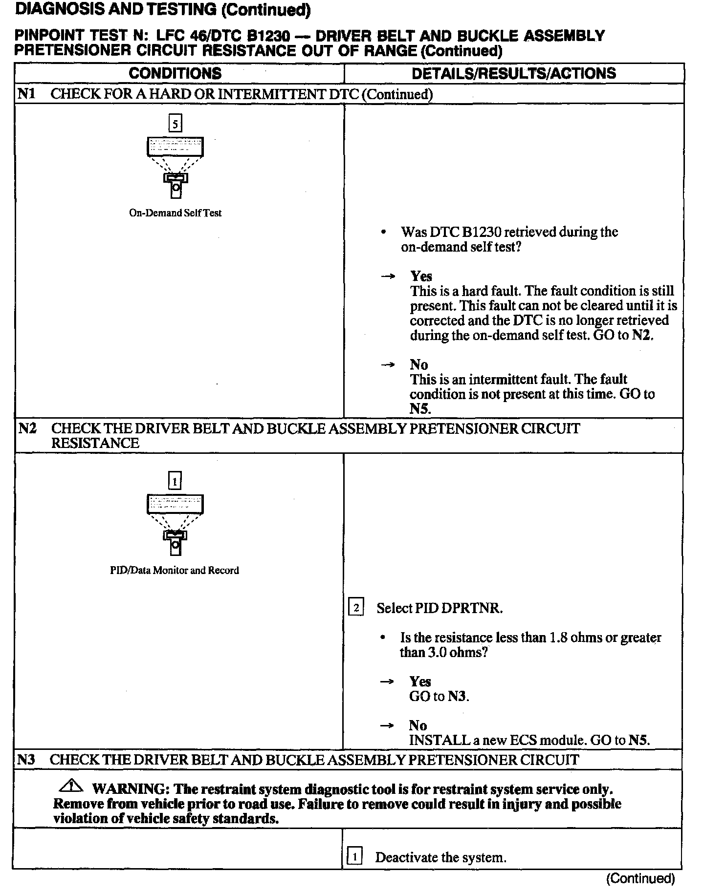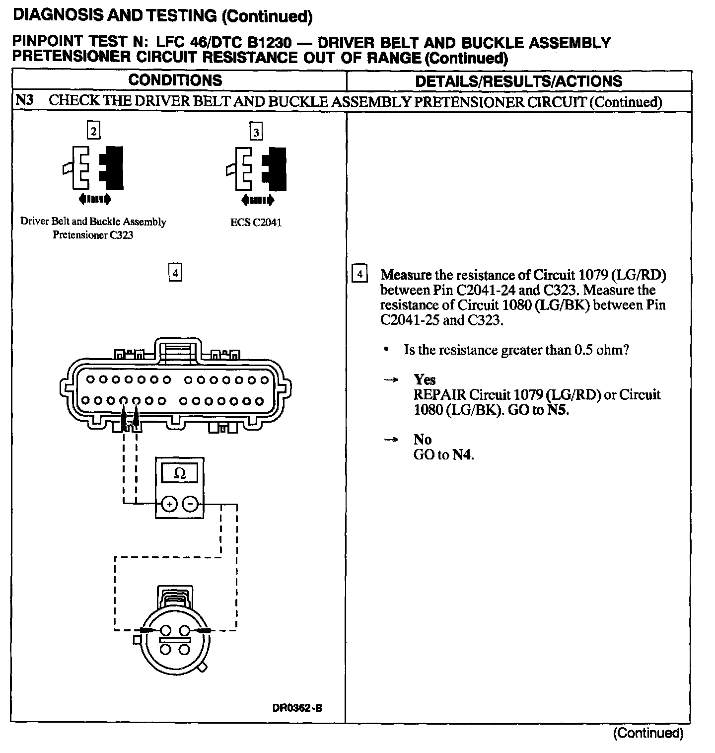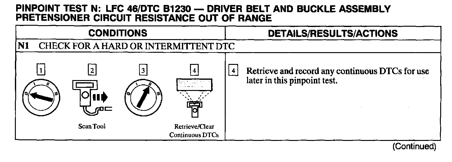 The air bag Electronic Crash Sensor (ECS) monitors the resistance of the driver belt and buckle assembly pretensioner circuit by measuring the resistance between Pins C2041-24 and C2041-25. If the ECS detects low or high resistance, the ECS will store DTC B1230 in memory and flash LFC 46 (or higher priority code if one exists) on the air bag indicator.