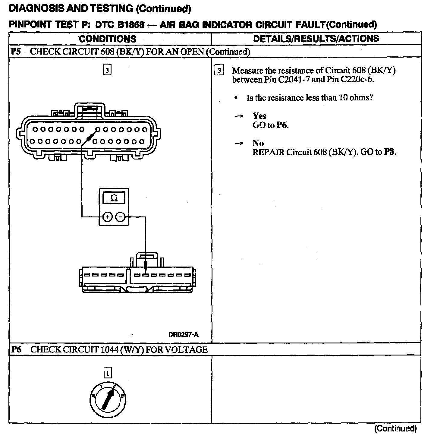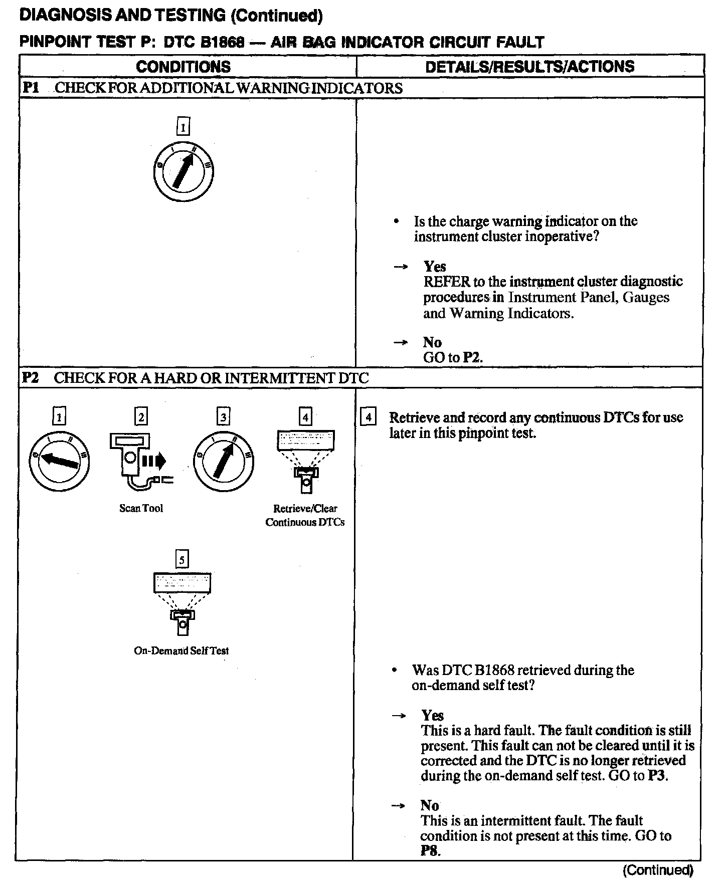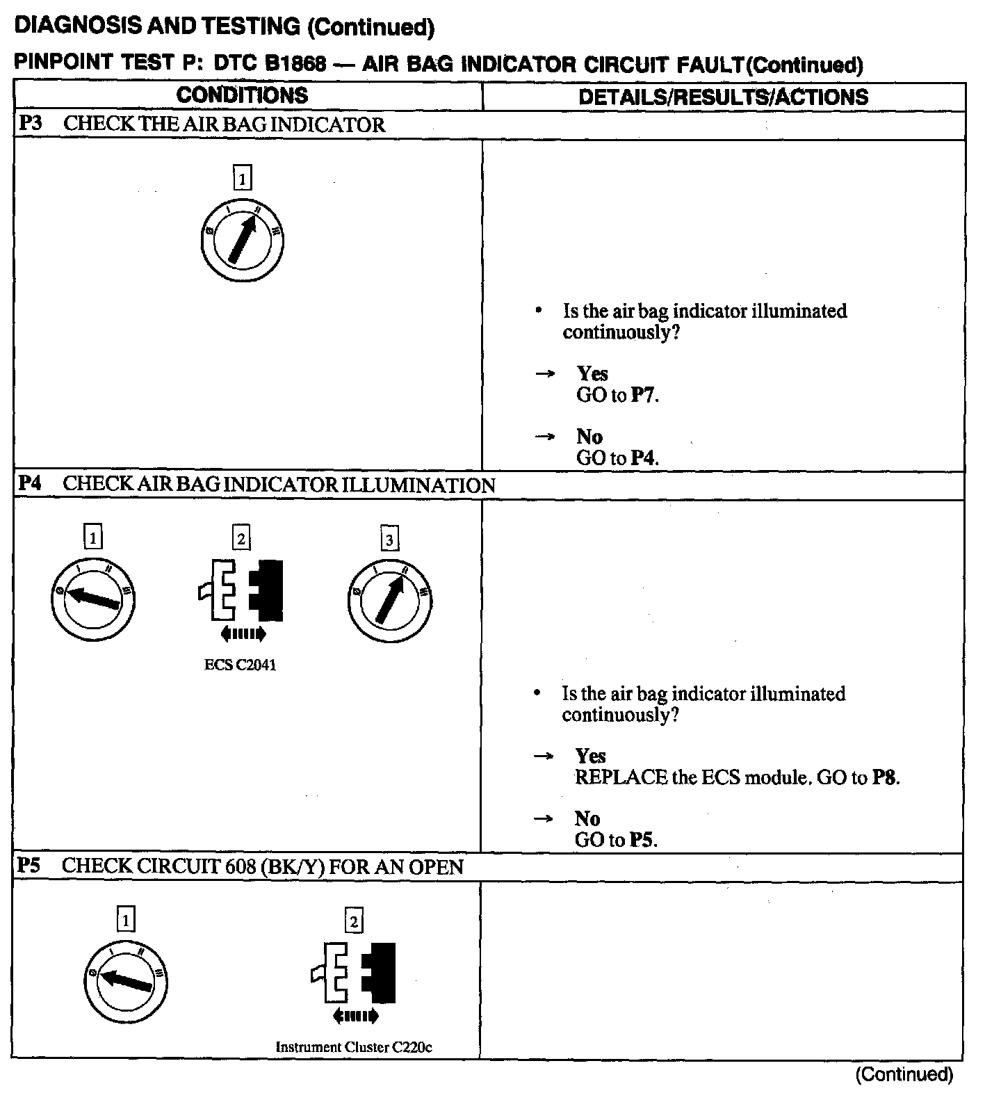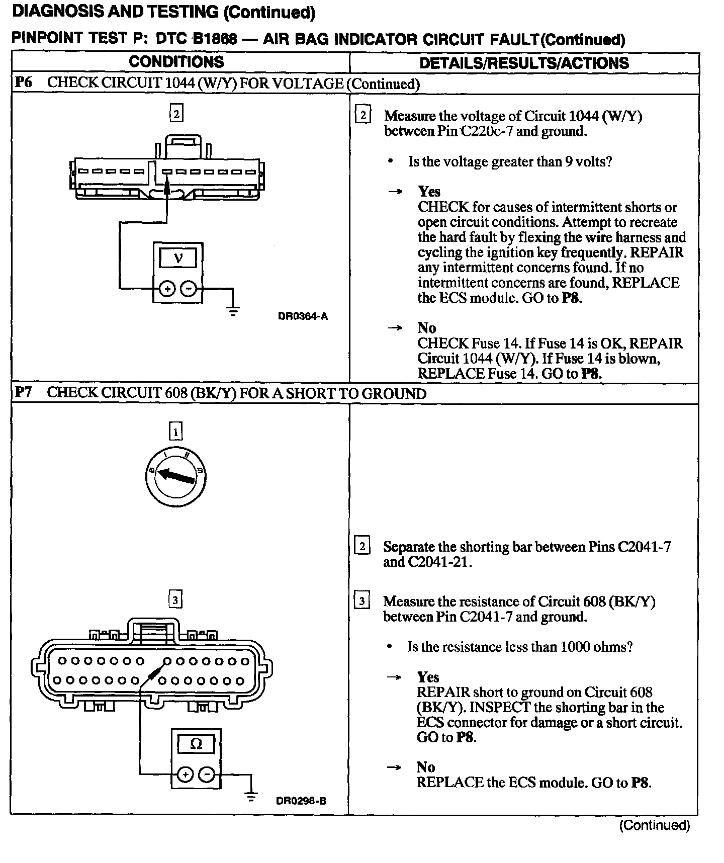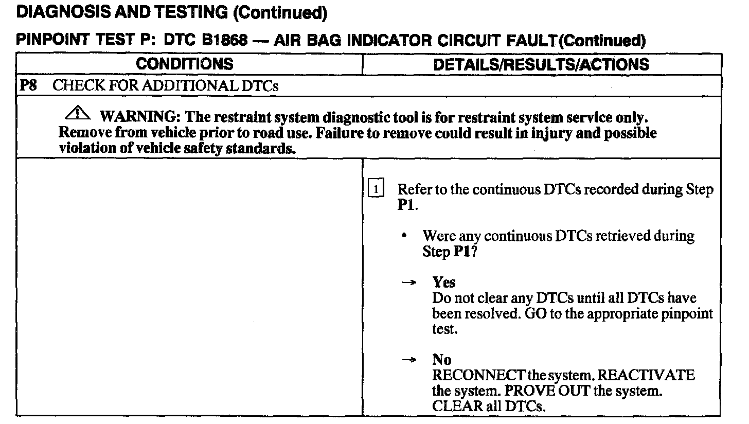 The air bag Electronic Crash Sensor (ECS) monitors the air bag indicator lamp for open and shorted conditions. If the ECS detects an open or shorted condition on the air bag indicator lamp circuit, the ECS will store DTC B1868 in memory.