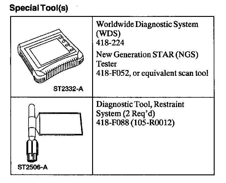 WARNING: THE RESTRAINT SYSTEM DIAGNOSTIC TOOL IS FOR RESTRAINT SYSTEM SERVICE ONLY. REMOVE FROM VEHICLE PRIOR TO ROAD USE. FAILURE TO REMOVE COULD RESULT IN INJURY AND POSSIBLE VIOLATION OF VEHICLE SAFETY STANDARDS.