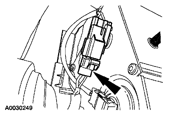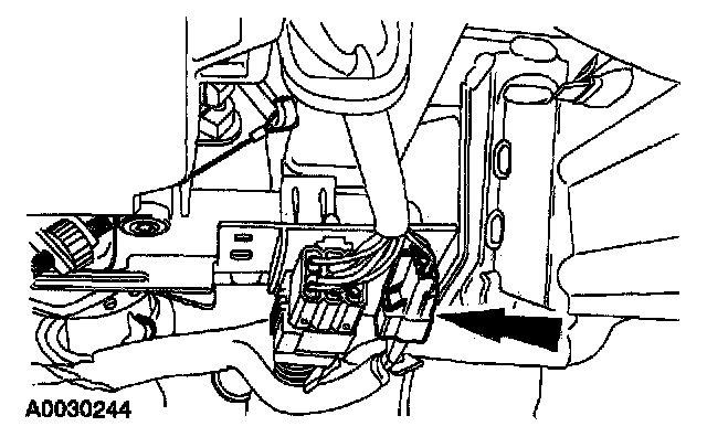9. Looking up, between the interior engine cover and the passenger air bag module, locate and disconnect the passenger air bag module electrical connector.