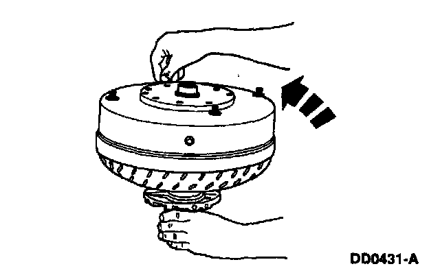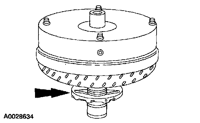 2. Mount the torque converter on the stator support so that the splines on the one-way clutch inner race engage the mating splines of the stator support.