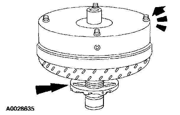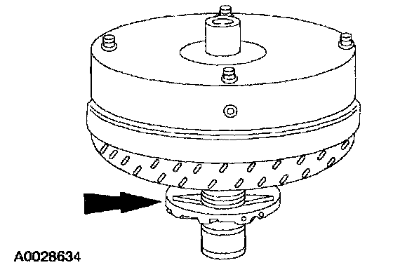 2. Mount the torque converter on the front pump support with the splines on the one-way clutch inner race, engaging the mating splines of the front pump support.