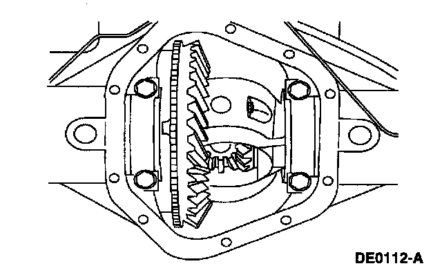 5. CAUTION: Note the positions of the mating letters stamped vertically and horizontally on the bearing caps and the differential housing before removing the bearing caps. Matching the letters is important at the time of assembly.