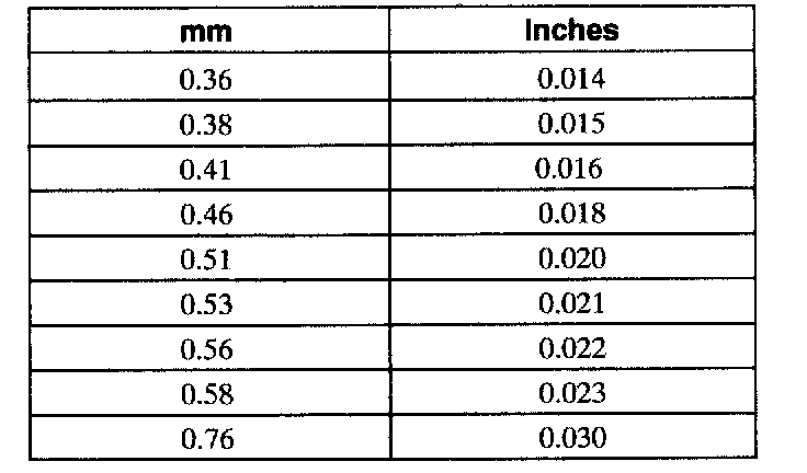 Inspect the drive pinion bearing preload shims for damage. Discard them if necessary. New shims are available in the thickness shown in the following chart.