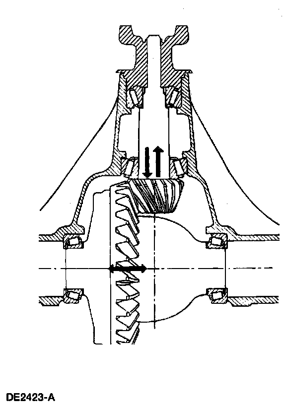 - The direction arrow pointing toward the pinion flange indicates that by removing the drive pinion position shim, the distance from the centerline of the tubes to the pinion backface increases, giving a plus (+) reading. The drive pinion bearing preload shim pack does not affect the pinion depth setting. However, if the pinion position is changed, the pinion preload will change and may require adjustment to bring the torque-to-rotate within specification. Arrows on the ring gear illustrate the method to increase or decrease backlash and differential bearing preload.