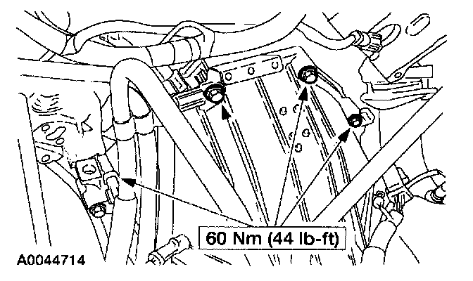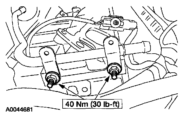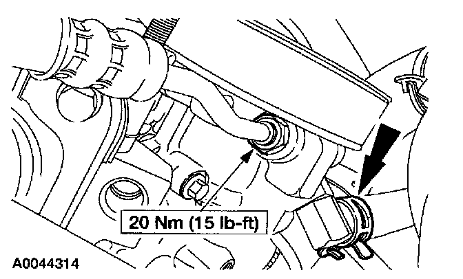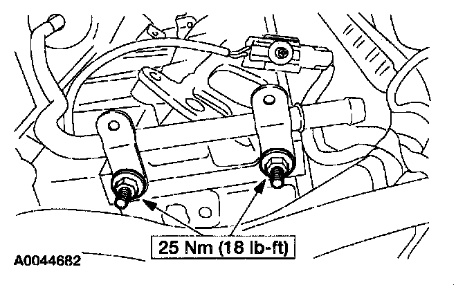 25. Position the fuel line and the LH Heated Oxygen Sensor (H02S) brackets. Install the four upper transmission-to-engine bolts.