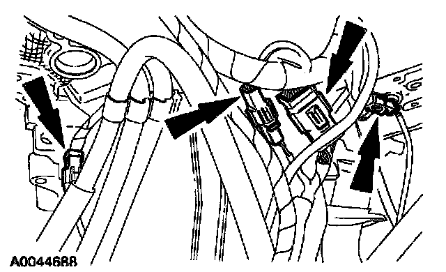 26. Connect the transmission wiring harness and the LH and RH H02S electrical connectors. Install the transmission wiring harness connector retainer in the bracket.