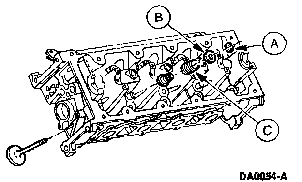5. Remove the (A) valve spring retainer keys, the (B) valve spring retainers, and the (C) valve spring.
