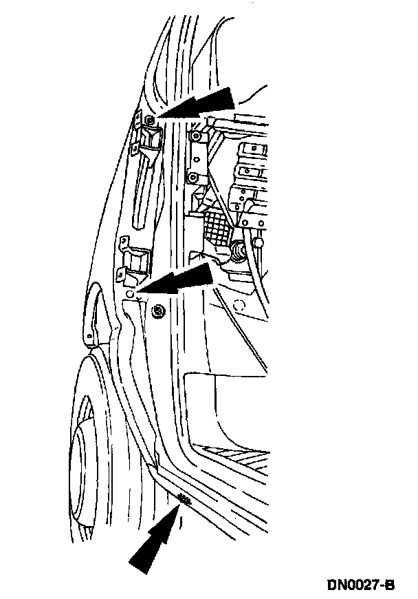 3. With the front door open, remove the fender-to-cowl side brackets retaining bolts, and the bolt and shims securing the lower rear of the fender.