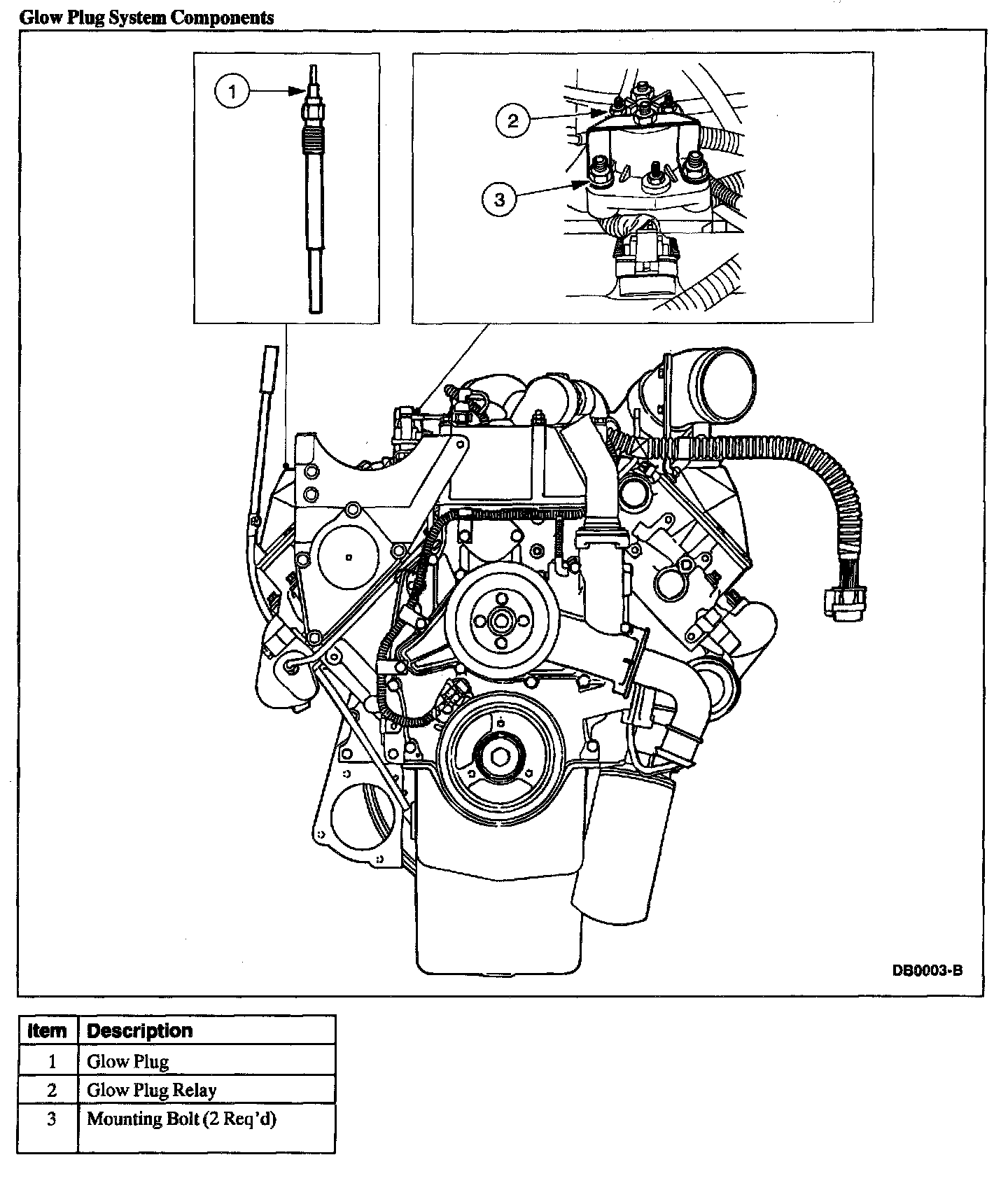 The 7.3L diesel engine uses a glow plug system that preheats air in the combustion chamber to improve cold engine starting.