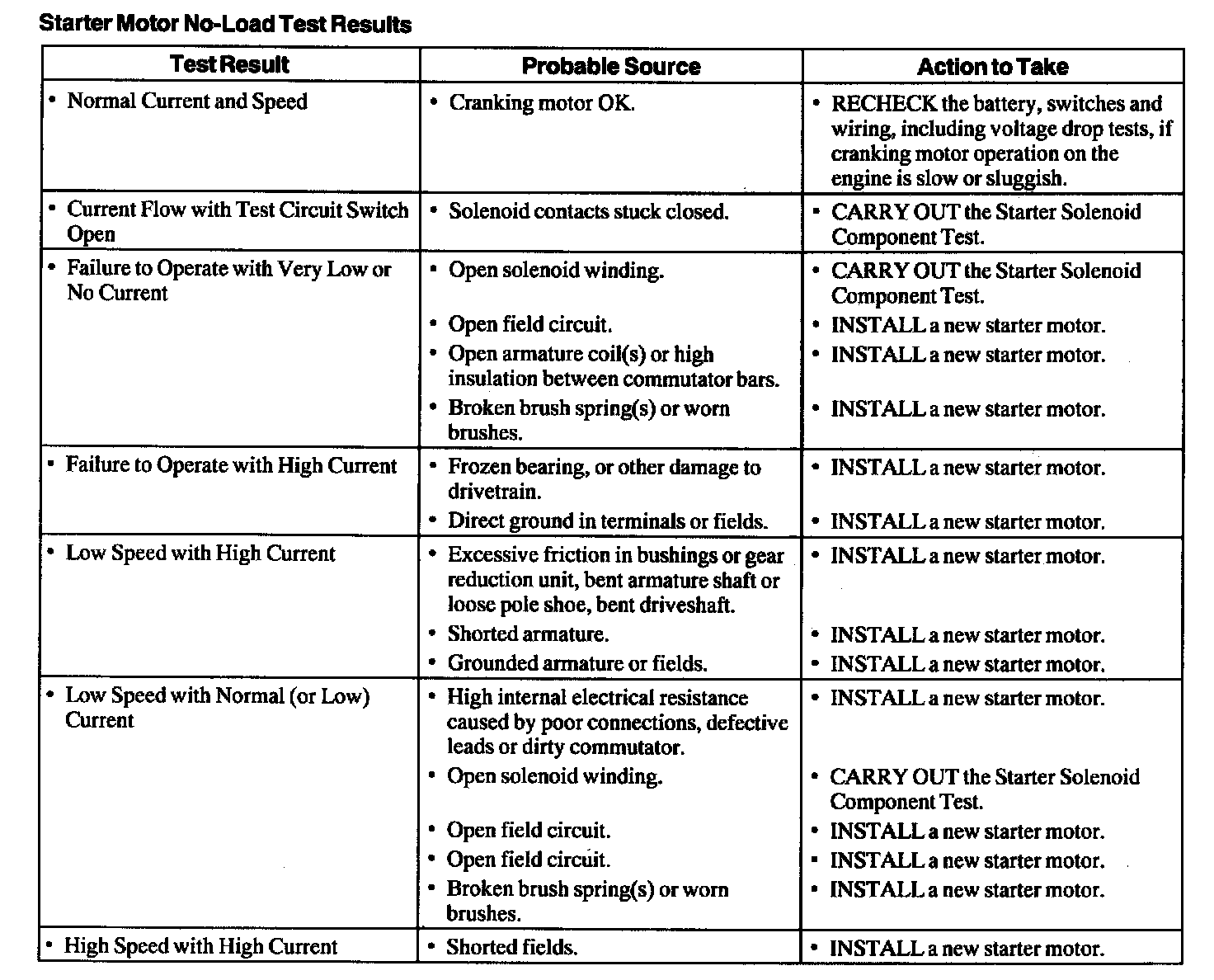 Starter Motor No-Load Test Results: